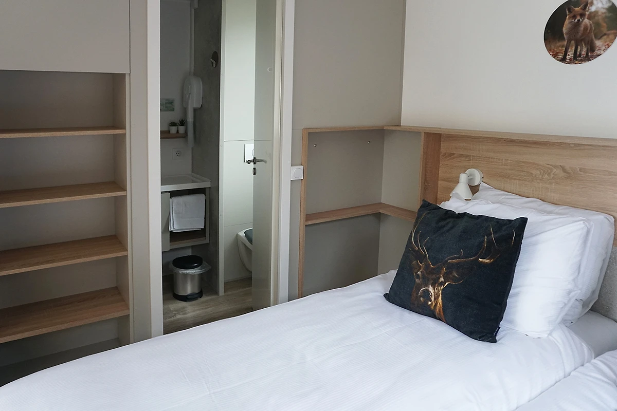 Einzigartige Hotellodge für zwei – Luxus, Komfort und Natur in der VeluweGönnen Sie sich einen entspannten Aufenthalt in unserer stilvollen Hotellodge für zwei Personen, gelegen in einer autofreien Zone des Parks. Diese gemütliche Lodge vereint den Komfort eines Hotelzimmers mit der Wärme eines Ferienhauses. Geniessen Sie eine komfortable Wohnlandschaft mit Kitchenette, ein luxuriöses Boxspringbett und moderne Annehmlichkeiten wie Geschirrspüler, Nespresso-Kaffeemaschine und zwei Flachbildfernseher. Das Badezimmer bietet ein Waschbecken, eine Toilette und eine separate Dusche für einen perfekten Start in den Tag.Beginnen Sie den Morgen mit einem leckeren Frühstück mit regionalen Produkten in unserem Restaurant, nur wenige Gehminuten entfernt. Dank unseres nachhaltigen Unterkunftskonzepts sind die Betten bei Ankunft frisch bezogen und ein Handtuchset liegt bereit – für einen sorgenfreien Aufenthalt.Entdecken Sie die Veluwe