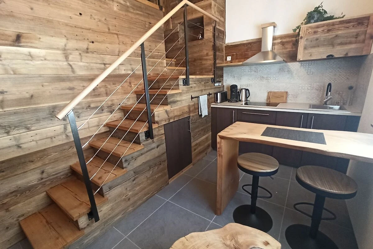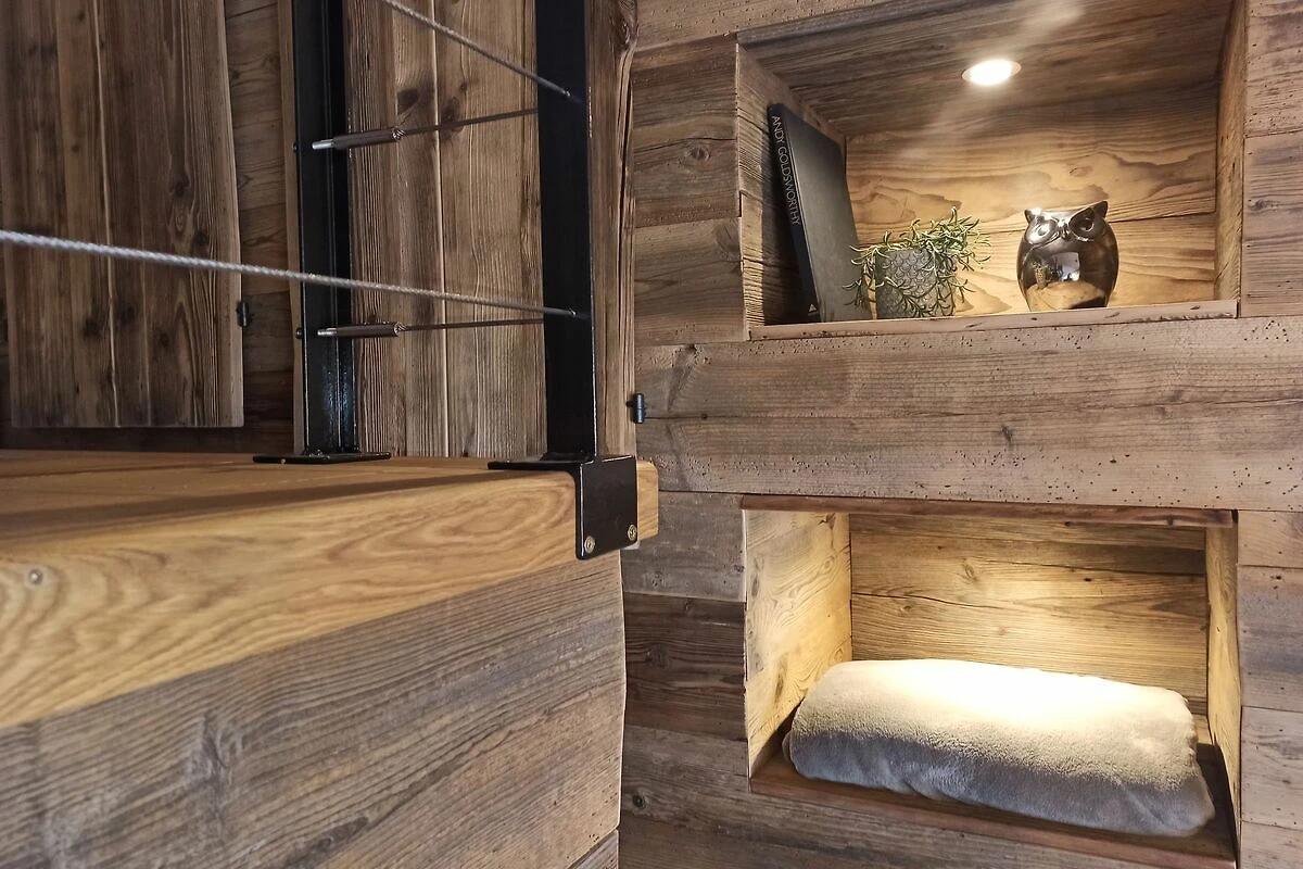 Die hellen 2-Zimmer-Suiten verfügen über einen grosszügigen Südbalkon mit traumhaften, unverbauten Blick auf die umliegende Bergwelt, auf die Zugspitze und im Herbst zusätzlich auf die imposanten Tiroler Hirsche, die direkt vor dem Haus äsen. Die kleine Berg-Maisonette besticht durch ihren gemütlichen Tiny-House Charakter auf zwei Etagen in rustikaler Altholzoptik.