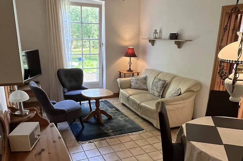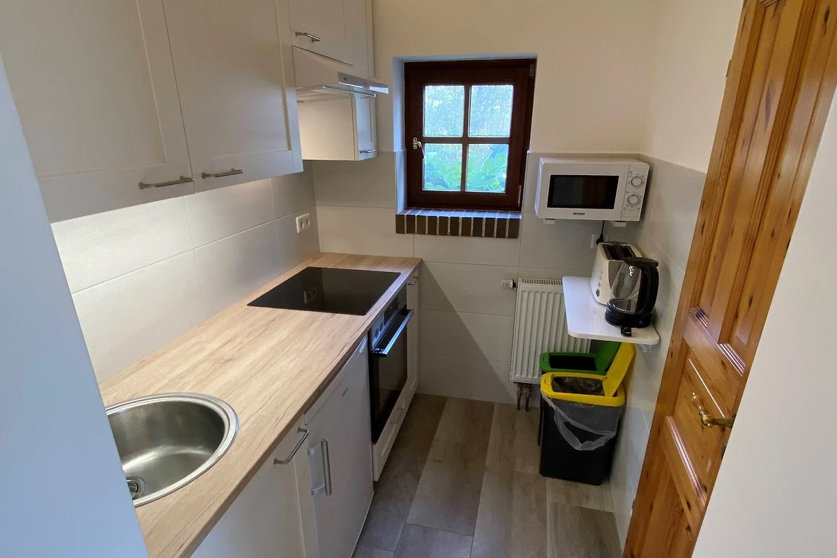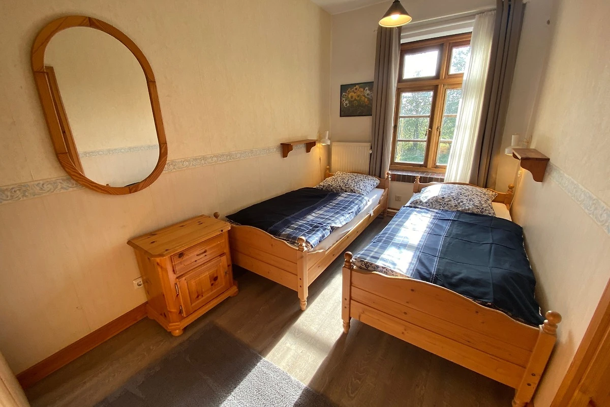 Die Ferienwohnung 1 liegt im Erdgeschoss und hat ca. 55m² und eine eigene Terrasse sowie zwei Schlafzimmern (zwei Einzelbetten und ein Etagenbett) für bis zu vier Personen. Badezimmer und Küche wurden Anfang 2021 komplett saniert. Die Schlafzimmer wurden im Januar 2023 renoviert.
