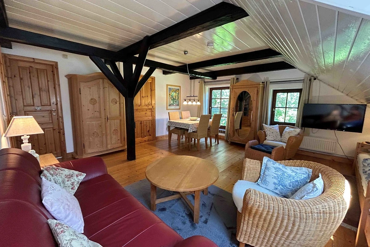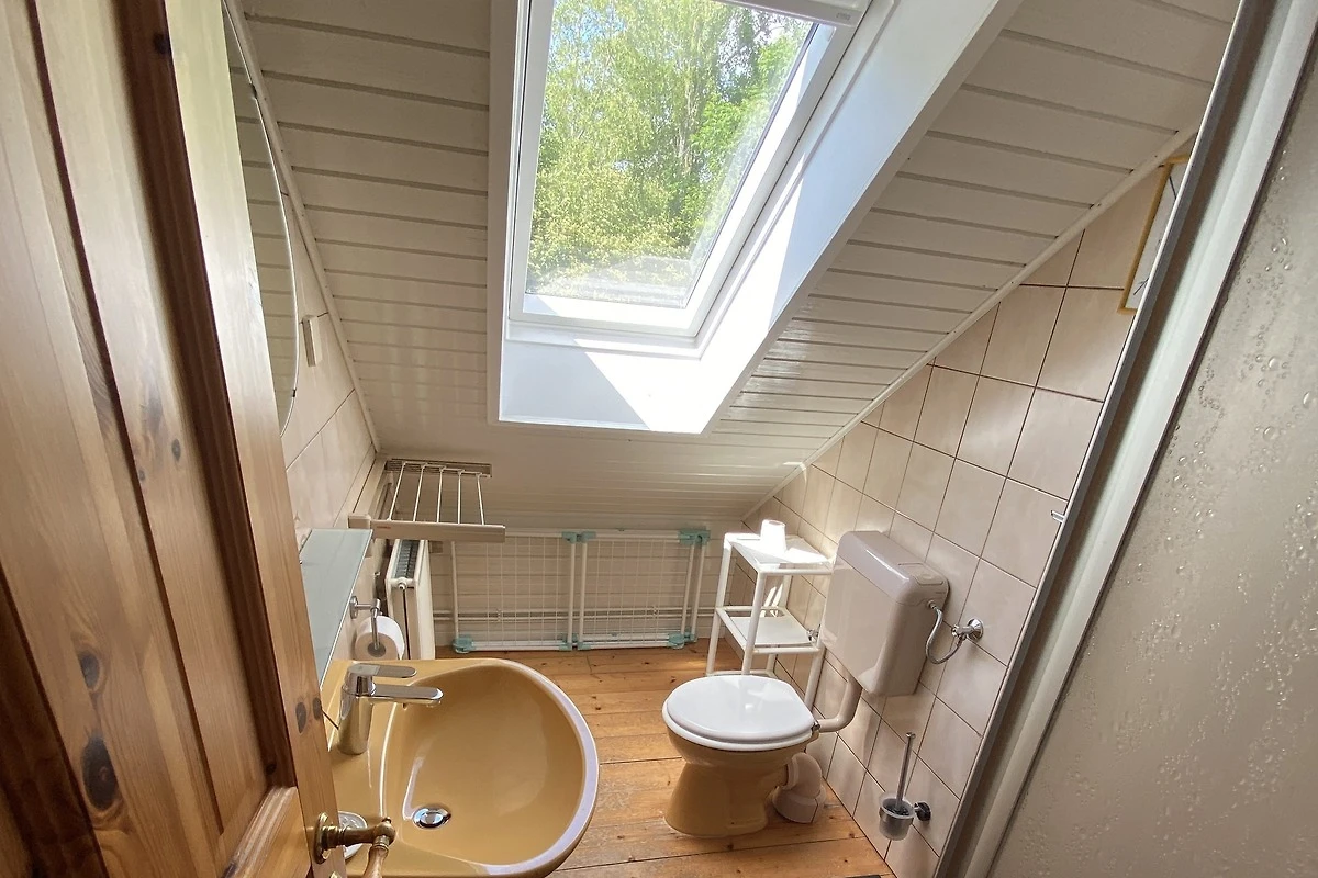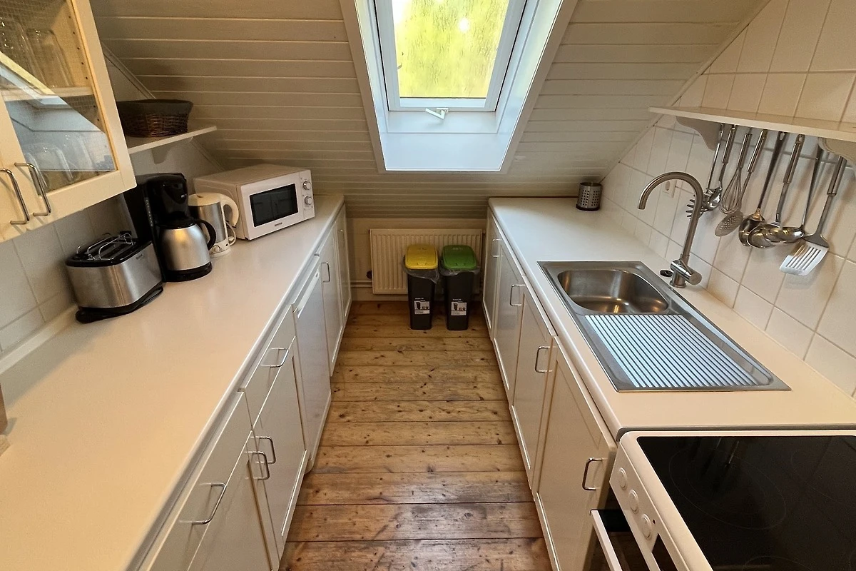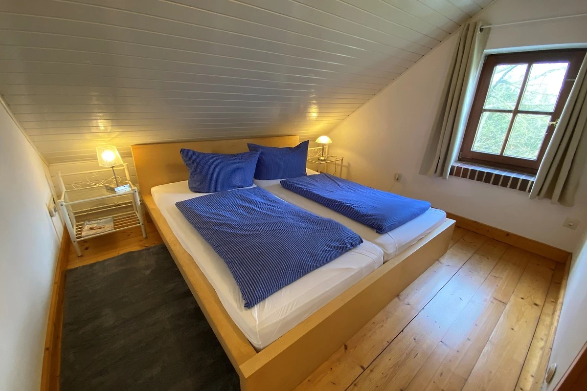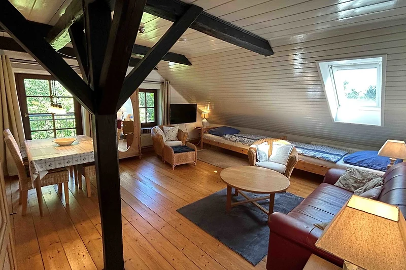 Die Ferienwohnung 4 liegt im Dachgeschoss und hat ca. 50m². Sie ist für bis zu 4 Personen geeignet und hat ein Schlafzimmer mit einem Ehebett sowie zwei Einzel-Betten im Wohnbereich. Diverse Sitzgelegenheiten sind auf dem Grundstück sind vorhanden.
