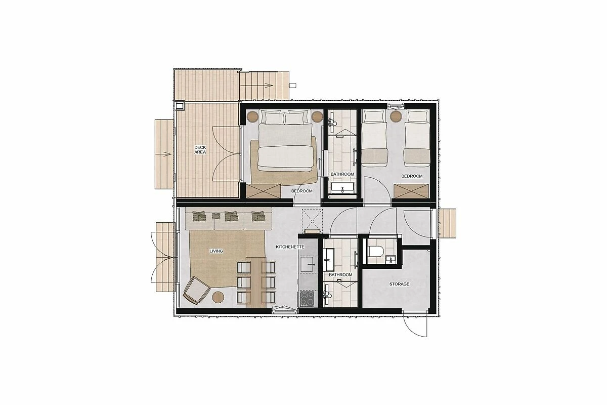 Parterre: (offene Küche(Kochplatte, Kaffeemaschine(cups), Kombi-Mikrowelle, Spülmaschine, Kühlschrank), Wohn/Esszimmer(Klimaanlage), Schlafzimmer(2x Einzelbett(Boxspring)), Schlafzimmer mit Badezimmer(Doppelbett oder 2 Einzelbetten(Boxspring), Dusche, Waschbecken), Badezimmer(Dusche(ebenerdige Dusche), Waschbecken), Toilette(Waschbecken), Gartentüren)