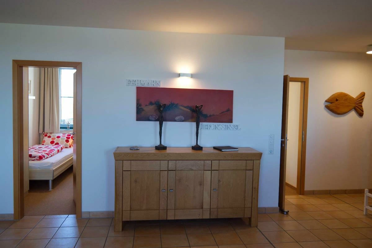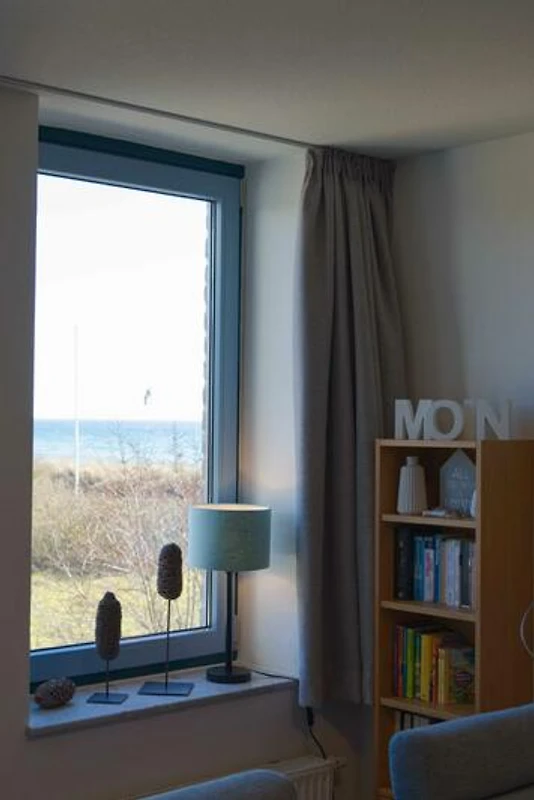 Betreten Sie die Ferienwohnung, um über den Flur am Badezimmer vorbei in das grosse, lichtdurchflutete Wohnzimmer zu laufen, in dem Sie viel Platz haben, um sich auszubreiten und es sich gemütlich zu machen. Schon von drinnen können Sie aus den Fenstern auf die Ostsee und den gelben Sand des Südstrands schauen und dem Meeresrauschen lauschen, wenn Sie die Fenster öffnen.