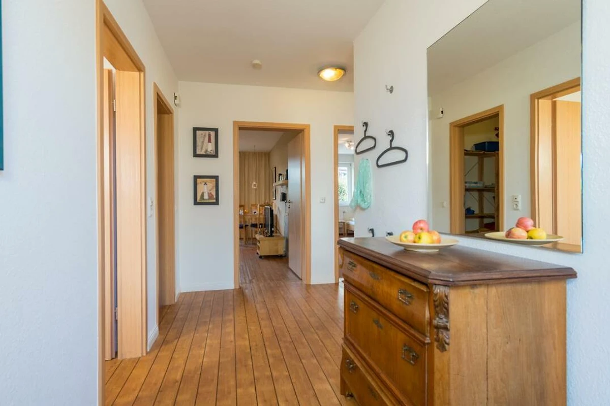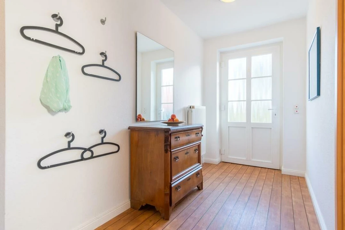 Betreten Sie die grosse Ferienwohnung durch einen separaten Eingang, kommen Sie auf den Flur mit viel Platz für Menschen und Hunde. Von dort aus kommen Sie dann in beide Schlafzimmer, das Wohnzimmer, Badezimmer, die Küche und auch den Abstellraum.