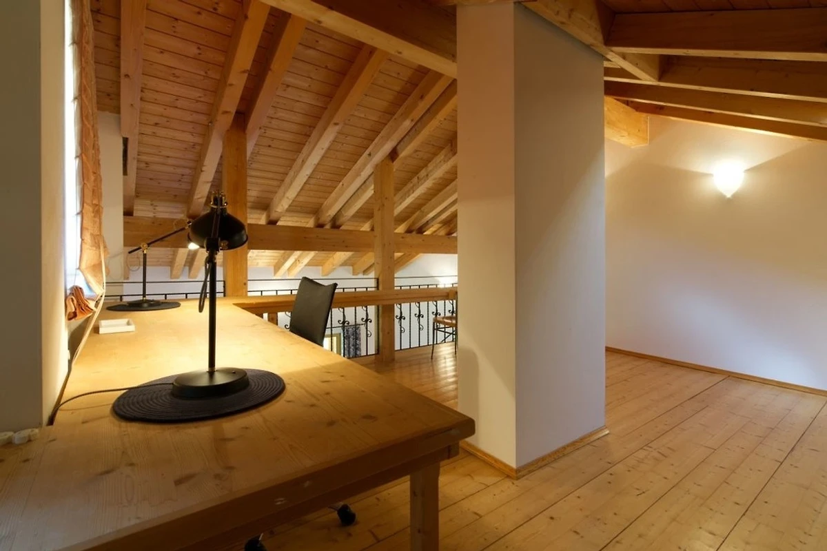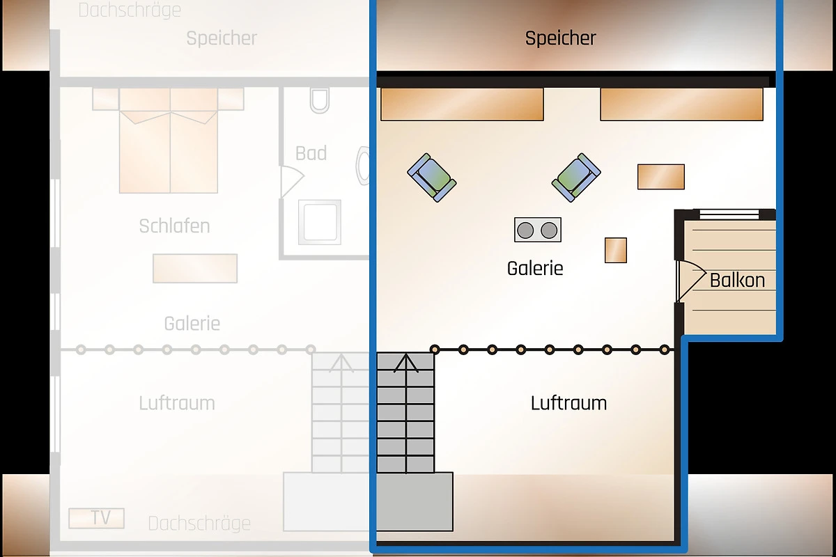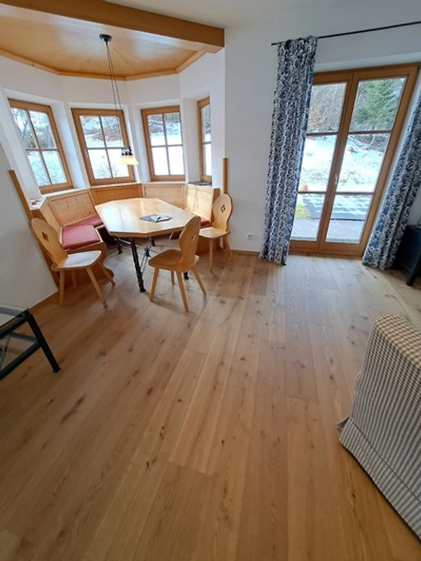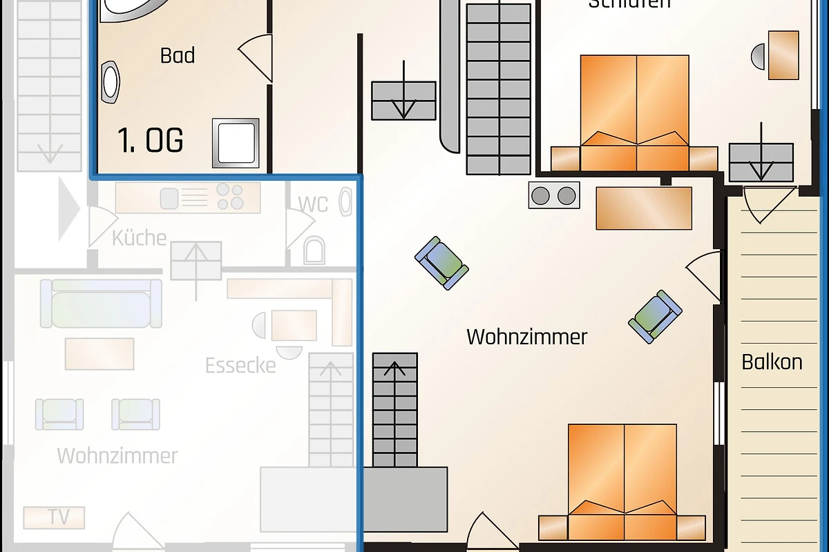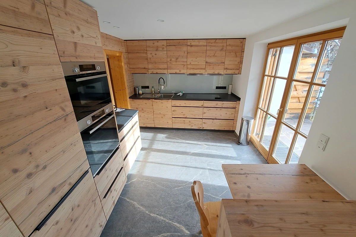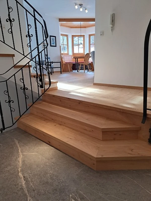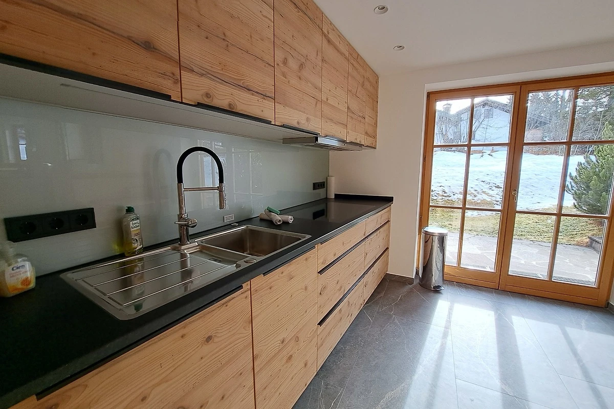 Das gemütliche Wohnzimmer und die Essecke im Erker bilden mit der neuen Luxus-Küche (Dez. 22) mit Ausstattung vom obersten Bord eine grosszügige, offene Einheit, im Sommer herrlich erweitert mit Rundum-Terasse und Freisitz. Auch Diele und Eingangsbereich mit Gäste-WC bieten viel Platz zum Ankommen und sind neu renoviert. Im Erdgeschoss befindet sich ein Schlafzimmer mit zwei Einzelbetten (90x200cm). Im Obergeschoss können Sie im grössten Schlafzimmer mit Galerie für Homeoffice-Pflichten einen Schwedenofen nutzen. Auf der Etage befindet sich ein zweites einladendes Schlafzimmer und das hochwertige Masterbad mit DU/WC/Badewanne. Grosse Balkone laden zu sonnigen Mussestunden mit Bergblick ein.