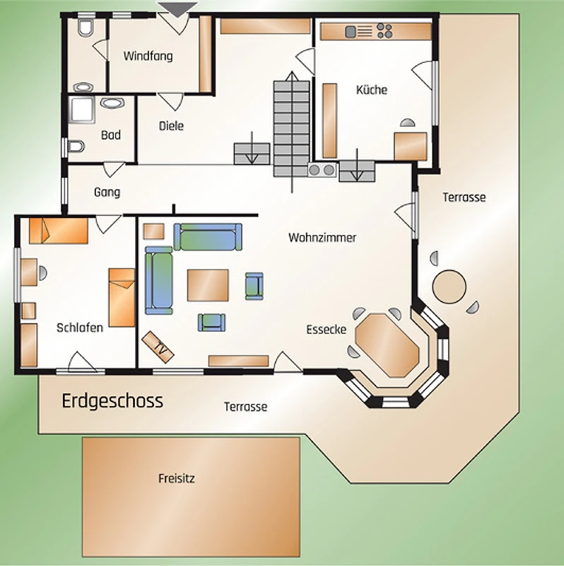 Das Wohnzimmer bietet mit zwei Sofas und Sesseln Platz für alle und ist mit Flachbild-TV (internetfähig) und Blueray Player ausgestattet. WLAN-Anschluss ist inklusive. Eine Besonderheit bieten die grosse Rundum-Terrasse und der Freisitz mit hochwertigem Esstisch und Sitzgelegenheiten. Von Sonnenauf- bis zum Sonnenuntergang werden Sie aufgrund der freien Südwest -Lage von der Sonne verwöhnt.