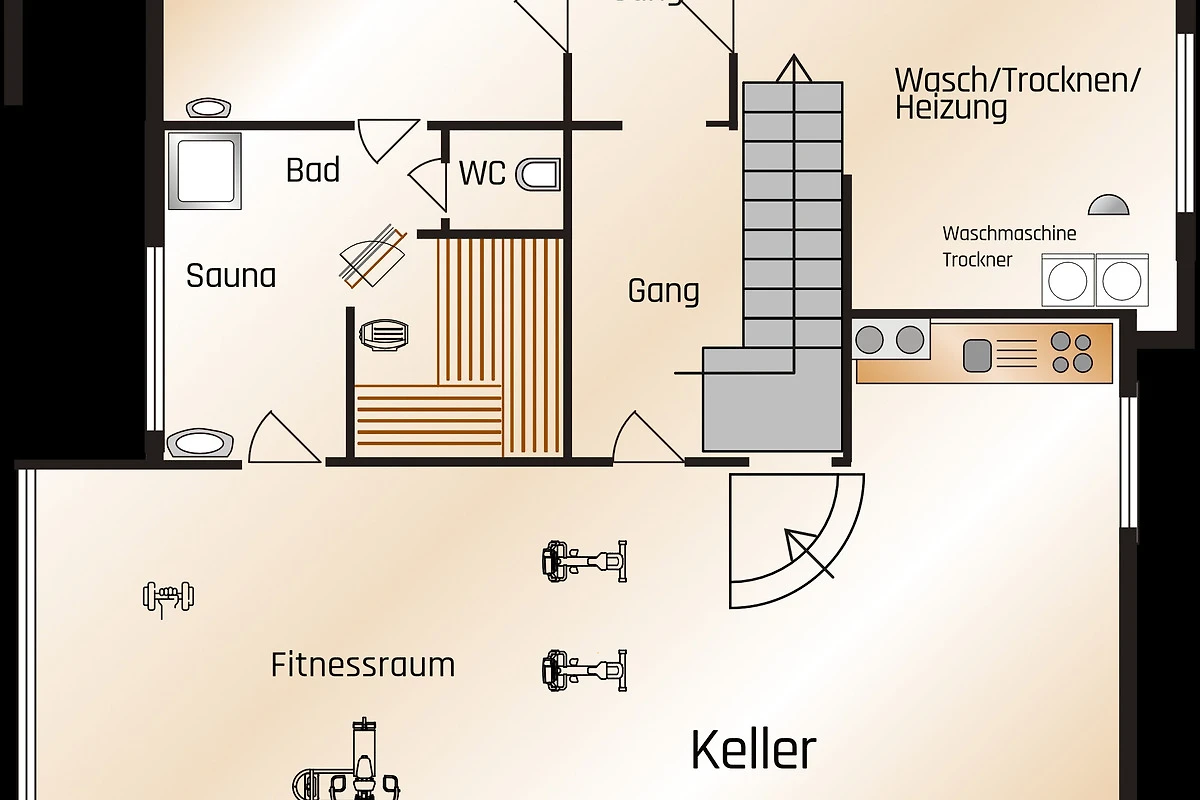 Im Erdgeschoss und 1. Stock (mit Galerie) befinden sich die drei Schlafzimmer, sowie zwei Badezimmer: ein Masterbad mit DU/Badewanne und WC und ein Duschbad mit WC. Im Keller steht Ihnen ein grossen Fitnessraum mit Crosstrainer, Ergometer, Kicker und viel Platz für Yoga & Co zur Verfügung, sowie die Sauna (gegen Gebühr) mit weiterer Dusche und WC - und der Wäschekeller.