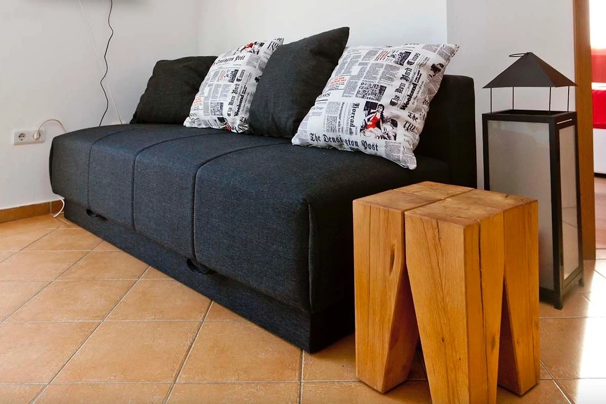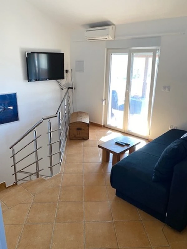 Im Aufenthaltsbereich haben Sie ein zusätzliches Sofa (kann zur grossen Schlafcouch ausgezogen werden) sowie einen Fernseher mit Sat-TV und eine Klimaanlage