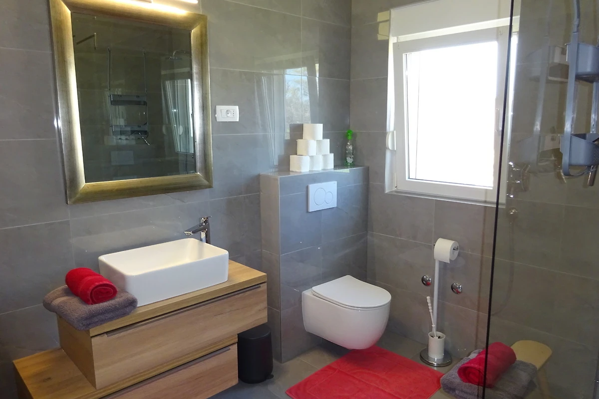 Sie haben ein grosses Badezimmer mit einer begehbaren Dusche. Im Badezimmer befindet sich auch noch ein Haarföhn zu Ihrer Verwendung.