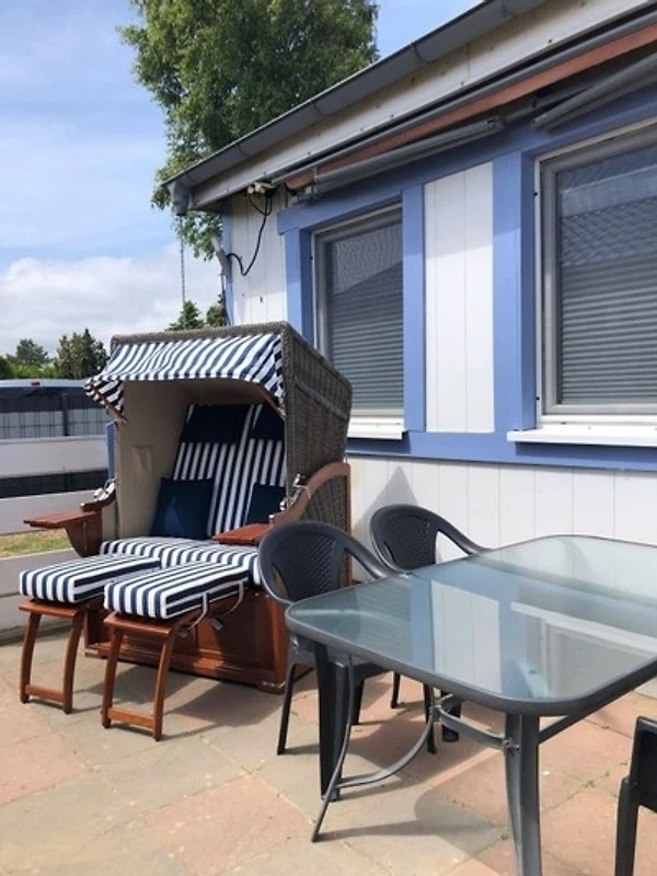 Die Wohnungen haben eine Grundfläche von ca. 45 m² und bestehen aus einem Wohnbereich mit Kunstledersofa, Sessel und eine bequeme Relaxliege, ein Flachbildfernseher, ein Radio und ein Esstisch für 4 Personen. In der offenen Küche finden Sie Herd mit Ceranfeld und Backofen, Kühlschrank mit Gefrierfach, Wasserkocher, Toaster, Kaffeemaschine, Mikrowelle usw. Ein Bad mit Waschbecken und Dusche. Es gibt jeweils 2 Schlafzimmer mit je 2 Einzelbetten und Schrank. Die Liegewiese und überdachte Terrasse mit Strandkorb, Gartenmöbeln und Grill laden zum relaxen ein.