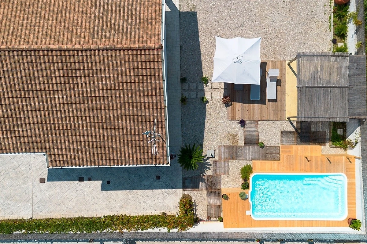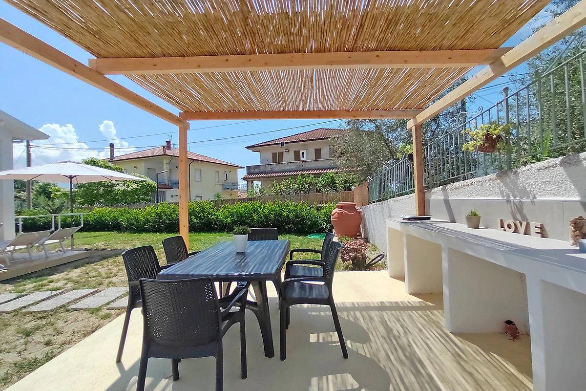 Villa Francesca Luisa's ca. 300 m², fenced outdoor area, where you find garden furniture, a sunshade, the pool and loungers as well as a grill at your disposal, is partly terrace, partly garden. The terrace runs round the house, is partly roofed and accessible from the living area and the ground-floor bedroom.