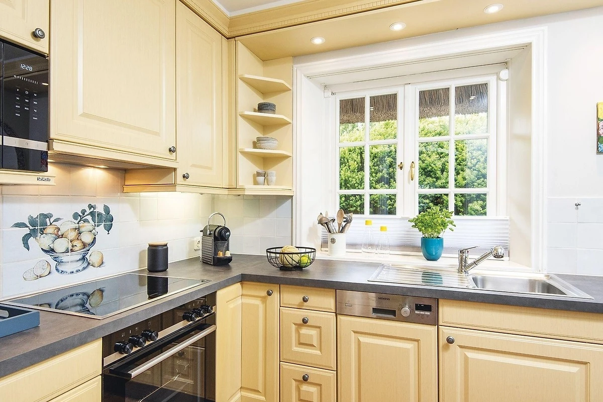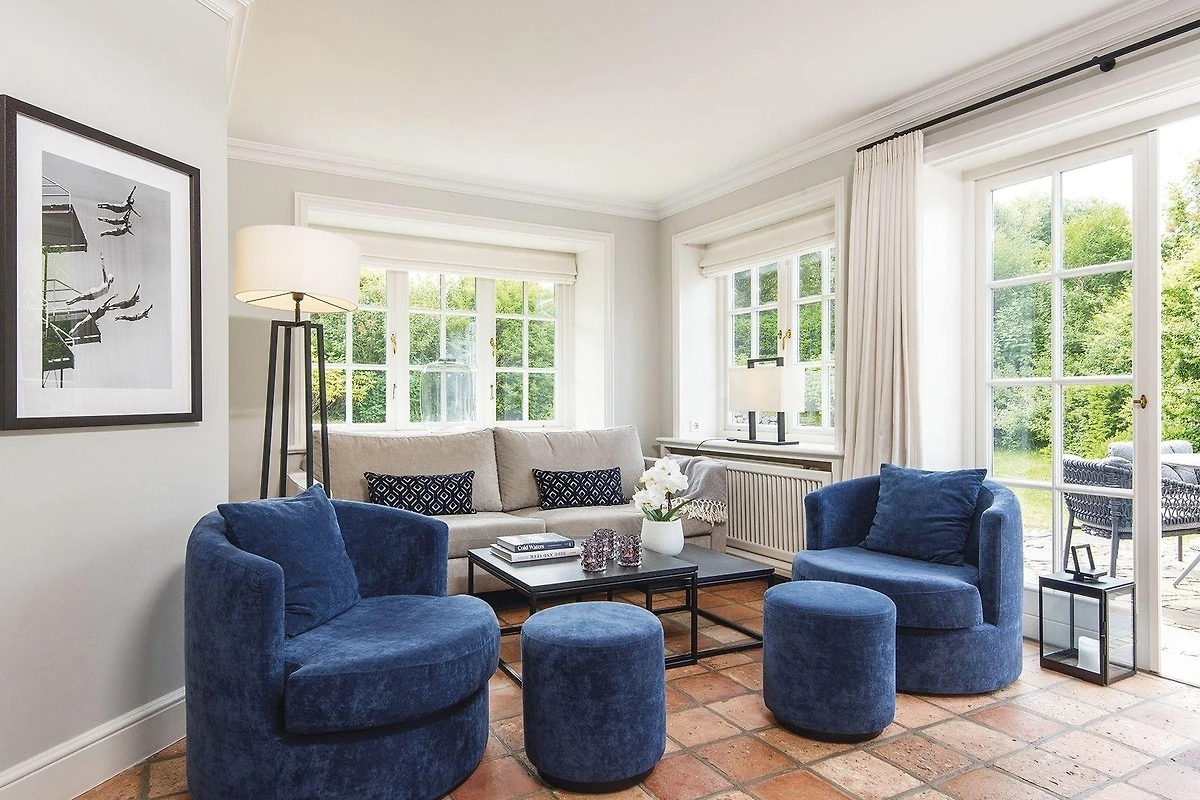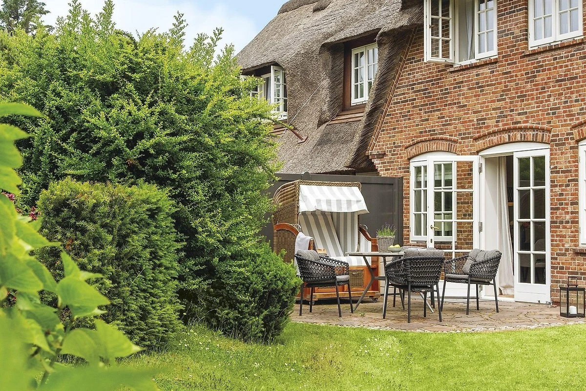 Ein elegant gemütliches Hausteil mit Platz für bis zu Fünf auf drei Etagen. Durch den kleinen Flur erreicht man direkt den stilvoll mit kleinen Farbakzenten eingerichteten Wohn-/Essbereich mit gemütlichen Polstermöbeln, Kamin, grossen Fensterfronten nach Süden und Osten und einem Esstisch für gemütliche Runden, nebst voll ausgestatteter separater Küche. Von hier haben Sie auch Zugang zum hübsch eingewachsenen Garten mit Terrasse und Strandkorb nach Südosten. Im hellen Untergeschoss gibt es ein gemütliches Doppelschlafzimmer mit grossem Einbauschrank und gleich nebenan ein grosszügiges Bad mit Eckbadewanne. Das Obergeschoss hält ein Einzelschlafzimmer und ein Doppelschlafzimmer mit geräumigen Einbauschränken, sowie ein modernes Duschbad bereit. Das familientaugliche Quartier ist mit Terracotta- und Echtholzfussböden ausgelegt.