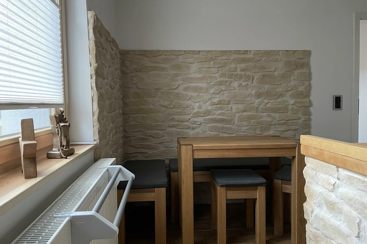 Unser Haus am Heldrastein wurde Anfang des Jahres komplett entkernt und hochwertig zu einem Ferienhaus ausgebaut. Dabei wurden u.a. zwei grosse Dachfenster Richtung Garten eingebaut und ein grosser Balkon angebaut. Auf ca. 130 qm Wohnfläche bietet das Haus ausreichend Platz für bis zu 6 Personen - 3 Schlafzimmer vorhanden. Ein PKW Stellplatz und eine Garage für die Unterbingung von Ihrem PKW oder Räder u. E-bikes kann genutzt werden. Haustiere sind gegen Gebühr bei uns herzlich willkommen. Die Bettwäsche und Handtücher können gerne dazu gebucht werden.