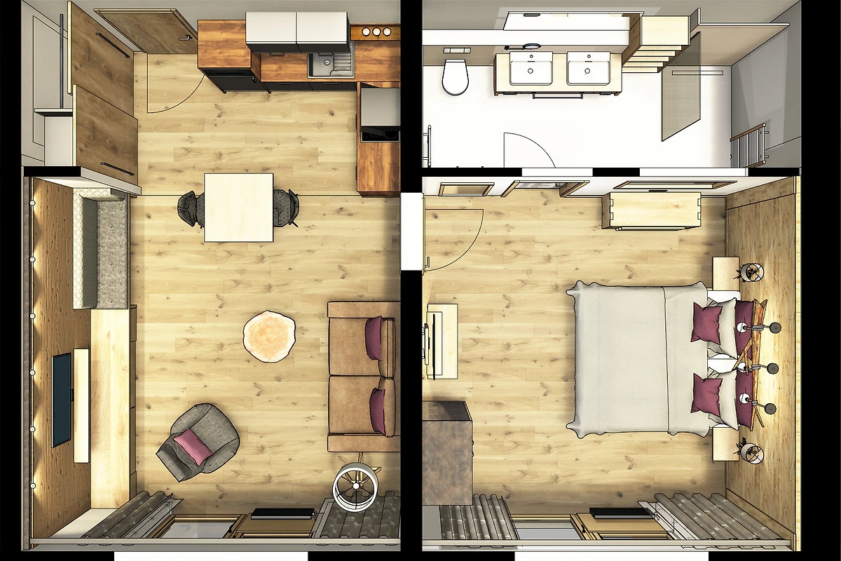Unser Maximilian Standard Plus Appartement mit ca. 50-60 m² bietet Ihnen vom Süd-Balkon einen schönen Blick in unsere Umgebung. Eine voll ausgestattete Wohnküche, ein gemütliches Sofa mit Schlaffunktion und ein zusätzlicher Loungesessel laden zum Entspannen ein. Das gemütliche Schlafzimmer mit Boxspringbett und ein geräumiges Bad mit begehbarer Regendusche runden den Wohlfühlfaktor ab.