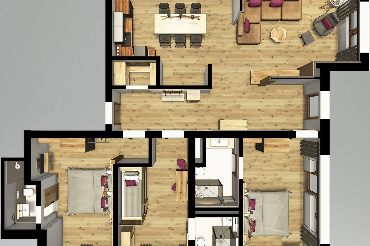 In unserem Exklusiv Maximilian mit 110 m² für bis zu 6 Personen wohnen Sie in einem traumhaften Appartement im 1.OG mit herrlichem Blick auf die Berglandschaft. 3 Schlafzimmer (2 Boxspringbetten und 1 Stockbett) mit jeweils eigenem Bad, eine offen gestaltete Küche mit grossem Esstisch und ein gemütlicher Wohnbereich bieten Ihnen viel Platz für die ganze Familie und sehr hohen Komfort.