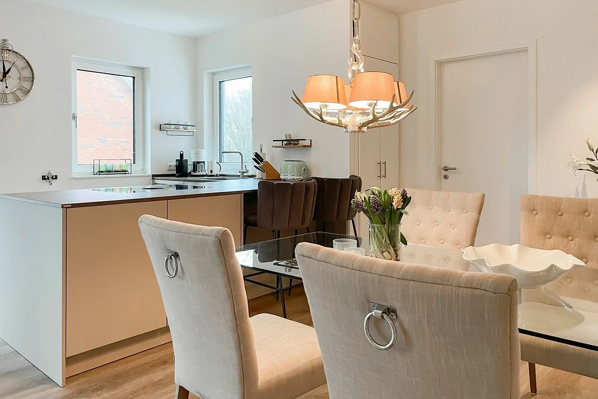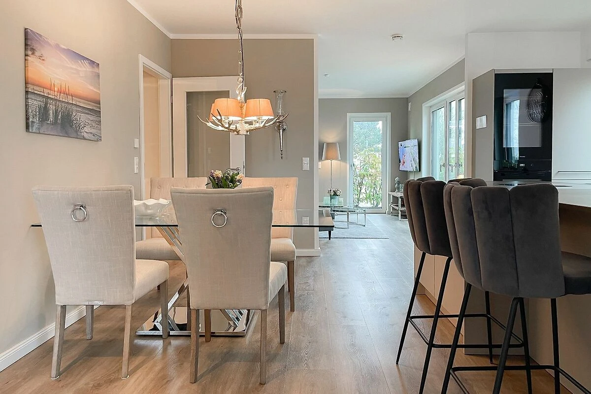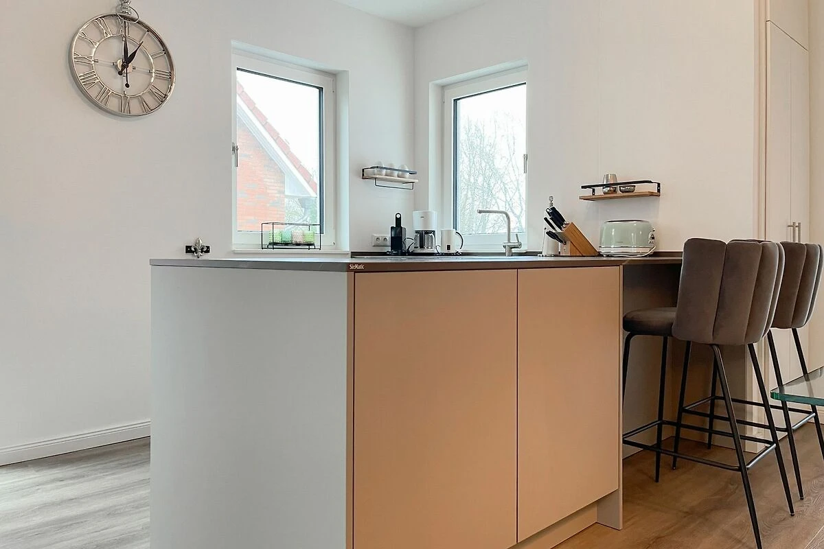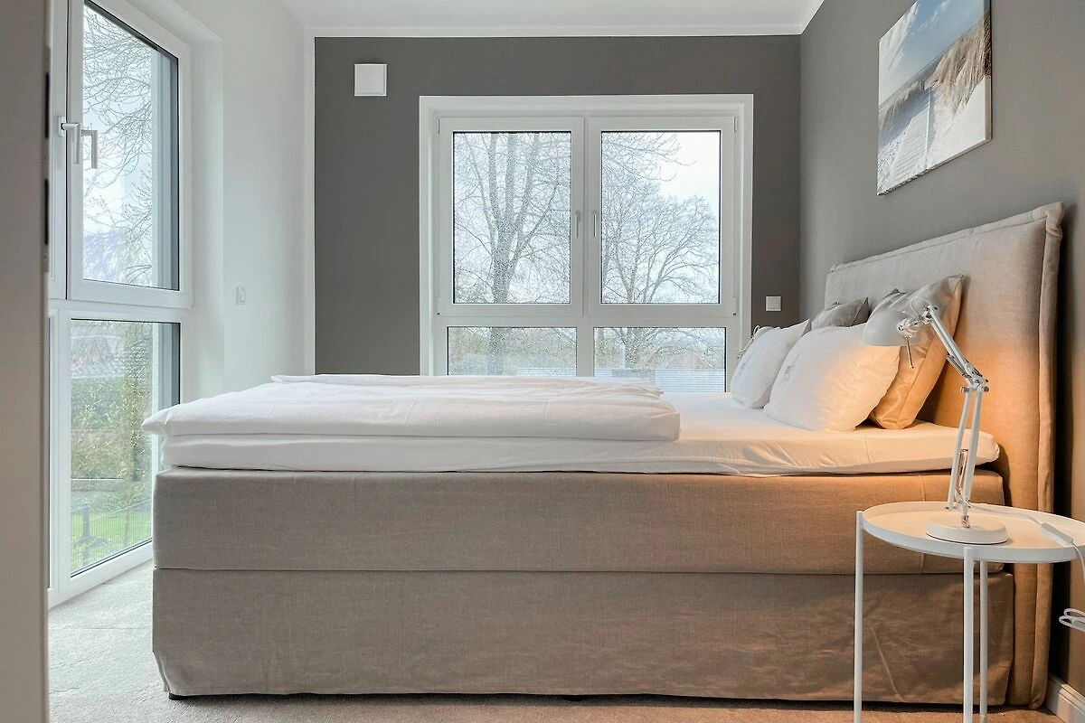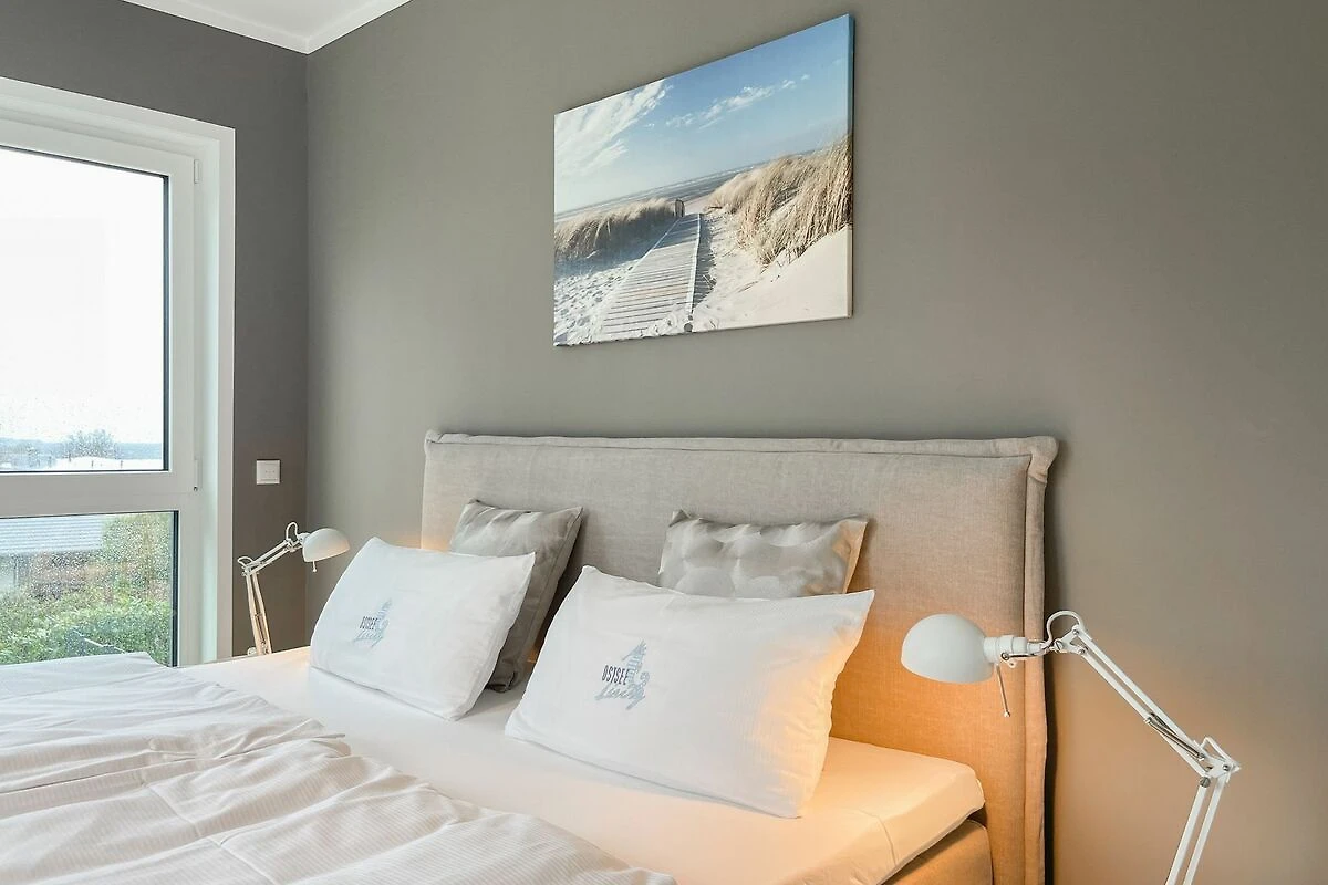 Es erwartet Sie eine äusserst hochwertig ausgestattete und geschmackvoll eingerichtete Ferienwohnung, die mit 2 separaten Schlafzimmern ausreichend Raum für 4 Personen bietet, um einen entspannten Urlaub in einem herrlichen Ambiente zu verleben. Fussbodenheizung, elektrische Aussenjalousien und bodentiefe Fensterelemente, die für ein offenes Raumgefühl sorgen, gewährleisten einen hohen Wohnstandard. Mittelpunkt der Ferienwohnung bildet die Siematic Design Küche mit Kochinsel in bester Ausstattung, die zum gemeinsamen Kochen einlädt und der anschliessende Essbereich im Hampton Style. Der behagliche Wohnbereich, eingerichtet mit Sofa und TV, bietet Blick und Zugang auf die grosszügig angelegte Westterrasse mit Gartenmöbeln und Sonnenliegen, um den Tag bei einem Glas Wein ausklingen, um den Tag bei einem Glas Wein mit Ostseeblick ausklingen zu lassen. Beide Schlafzimmer bieten einen herrlichen Ausblick bis auf bis auf das Meer und sind mit hochwertigem Teppichboden,[nbsp] Doppelbetten (180x200) und einem Kleiderschrank ausgestattet. In einem der Schlafräume befindet sich ein zusätzlicher Fernseher.[nbsp] Im Flur des Eingangsbereichs steht ein weiterer Einbauschrank für Jacken und Mäntel zur Verfügung. Das Bad ist sehr hochwertig und modern, ausgestattet mit einer XXL Walk In Dusche. Waschmaschine und Trockner befinden sich in einem Einbauschrank. WLAN steht selbstverständlich zur kostenlosen Nutzung zur Verfügung. Fahrräder können auf der Terrasse der Wohnung abgestellt werden.