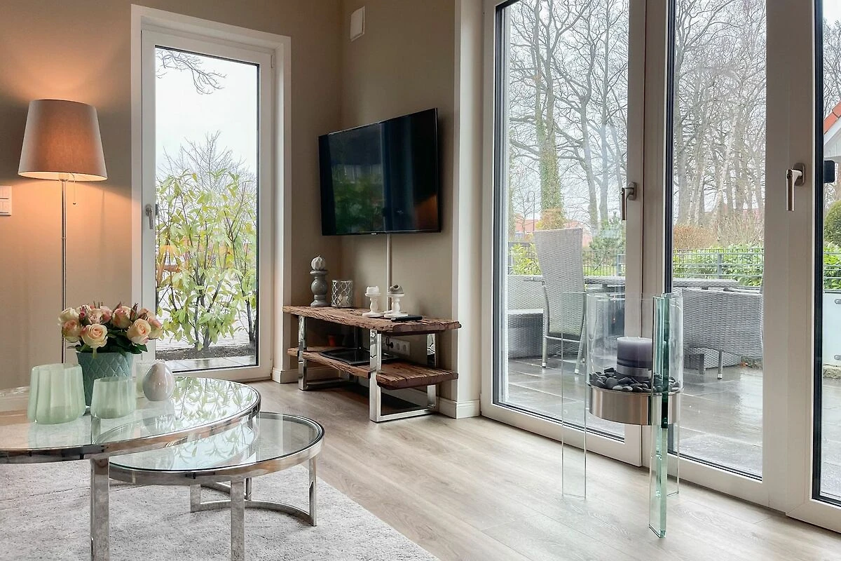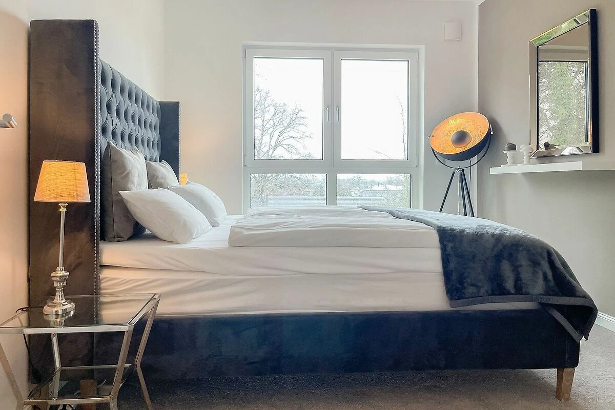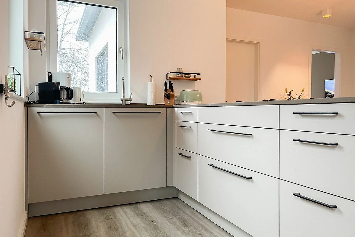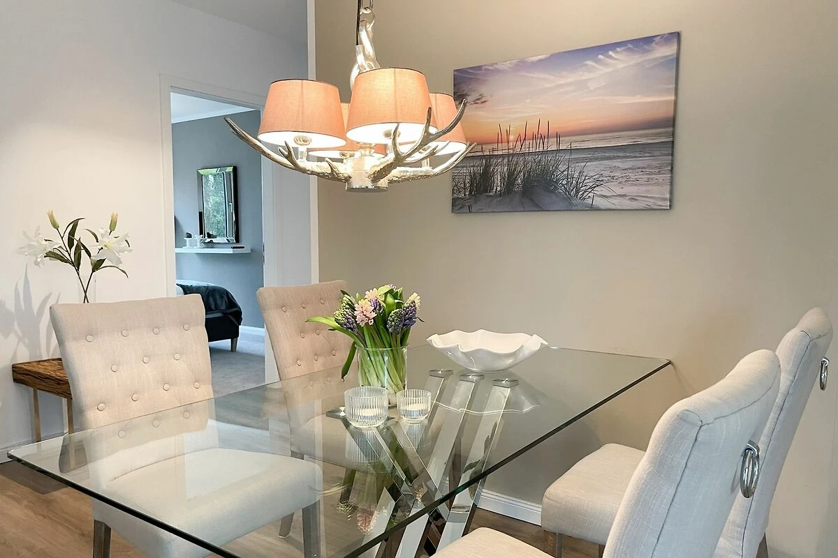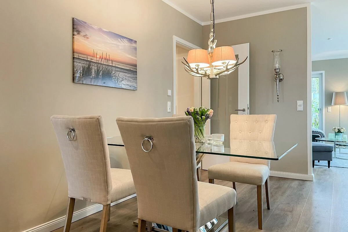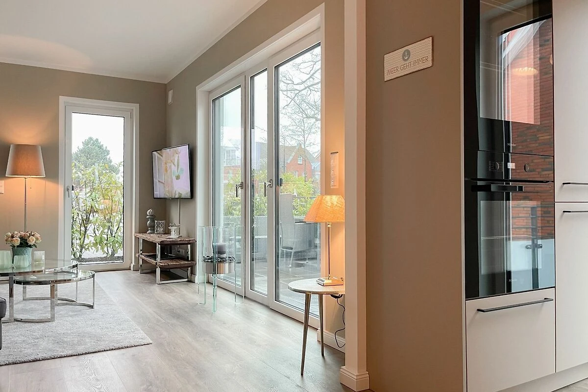 Es erwartet Sie eine äusserst hochwertig ausgestattete und geschmackvoll eingerichtete Ferienwohnung, die mit 2 separaten Schlafzimmern ausreichend Raum für 4 Personen bietet, um einen entspannten Urlaub in einem herrlichen Ambiente zu verleben. Fussbodenheizung, elektrische Aussenjalousien und bodentiefe Fensterelemente, die für ein offenes Raumgefühl sorgen, gewährleisten einen hohen Wohnstandard. Mittelpunkt der Ferienwohnung bildet die Siematic Design Küche mit Kochinsel in bester Ausstattung, die zum gemeinsamen Kochen einlädt und der anschliessende Essbereich im Hampton Style. Der behagliche Wohnbereich, eingerichtet mit Sofa und TV, bietet Blick und Zugang auf die grosszügig angelegte Westterrasse mit Gartenmöbeln und Sonnenliegen, um den Tag bei einem Glas Wein ausklingen, um den Tag bei einem Glas Wein mit Ostseeblick ausklingen zu lassen. Beide Schlafzimmer bieten einen herrlichen Ausblick bis auf bis auf das Meer und sind mit hochwertigem Teppichboden,[nbsp] Doppelbetten (180x200) und einem Kleiderschrank ausgestattet. In einem der Schlafräume befindet sich ein zusätzlicher Fernseher.[nbsp] Im Flur des Eingangsbereichs steht ein weiterer Einbauschrank für Jacken und Mäntel zur Verfügung. Das Bad ist sehr hochwertig und modern, ausgestattet mit einer XXL Walk In Dusche. Waschmaschine und Trockner befinden sich in einem Einbauschrank. WLAN steht selbstverständlich zur kostenlosen Nutzung zur Verfügung. Fahrräder können auf der Terrasse der Wohnung abgestellt werden.