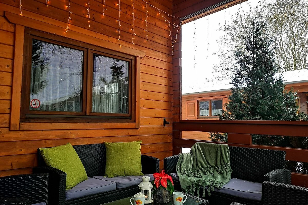 Die überdachte Terrasse ist mit Sitzmöglichkeiten bestückt.