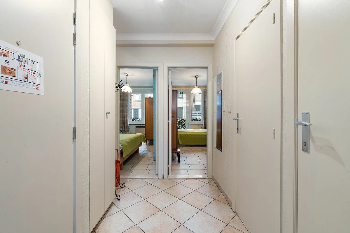 Das Apartment bietet bequem Platz für bis zu sechs Gäste und verfügt über zwei Schlafzimmer – eines mit Doppelbett, das andere mit Doppelbett und Etagenbett – sowie ein Doppelschlafsofa im Wohnbereich. Ein komplettes Badezimmer mit Badewanne, ein separates Gäste-WC sowie Annehmlichkeiten wie WLAN, Fernseher und ein Aufzug sorgen für einen angenehmen und komfortablen Aufenthalt.