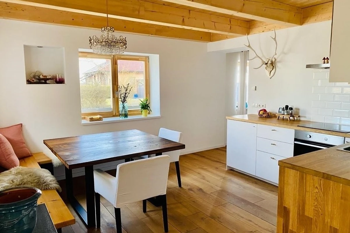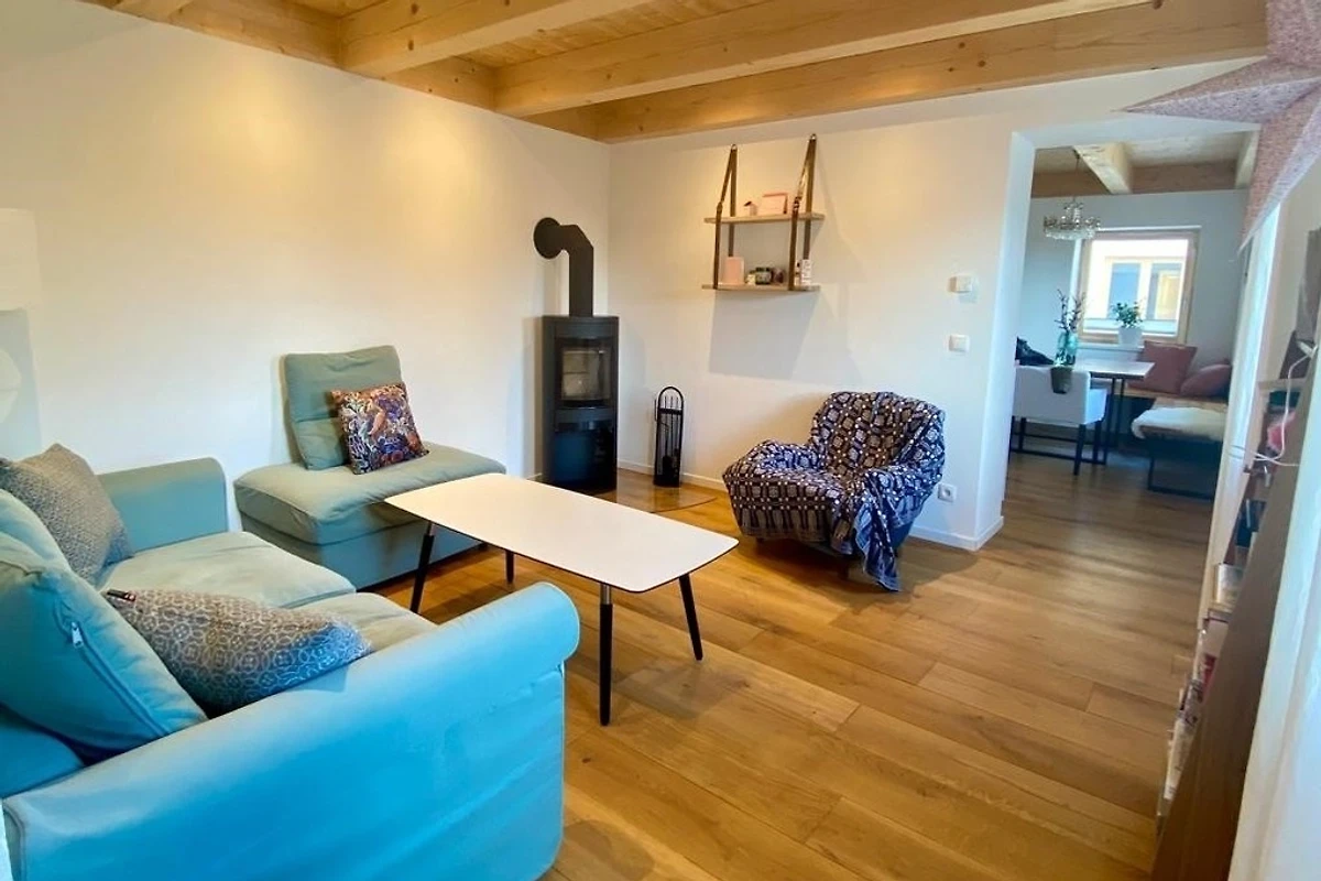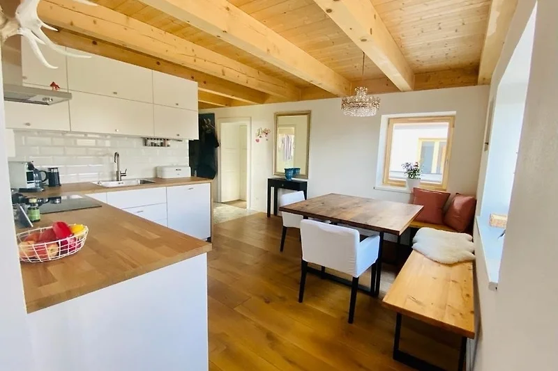Das Wohnzimmer ist gemütlich eingerichtet und ist mit einer Schlaf-Couch ausgestattet. Im Esszimmer befindet sich die Küche ins eine urgemütliche Essecke. Ist einem handgefertigten Tisch aus Altholz.