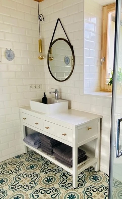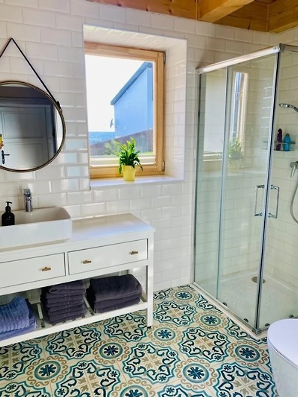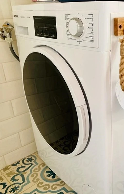 Im Badezimmer gibt es Dusche, Waschbecken, WC und eine Waschmaschine mit Trockenfunktion.