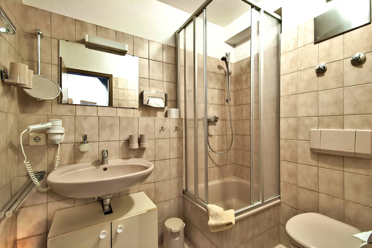 - Bad mit Dusche, Waschbecken, WC und Föhn
