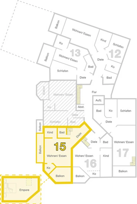 Das Apartment 15 ist ca 50m² gross, hat 2 Schlafzimmer (eines davon auf der Galerie), einen kleinen Balkon und ist für maximal 6 Personen geeignet.