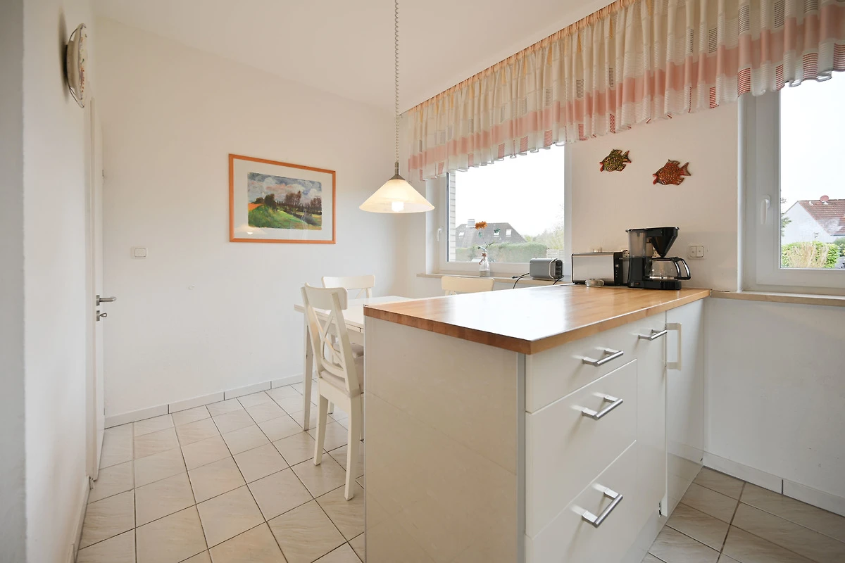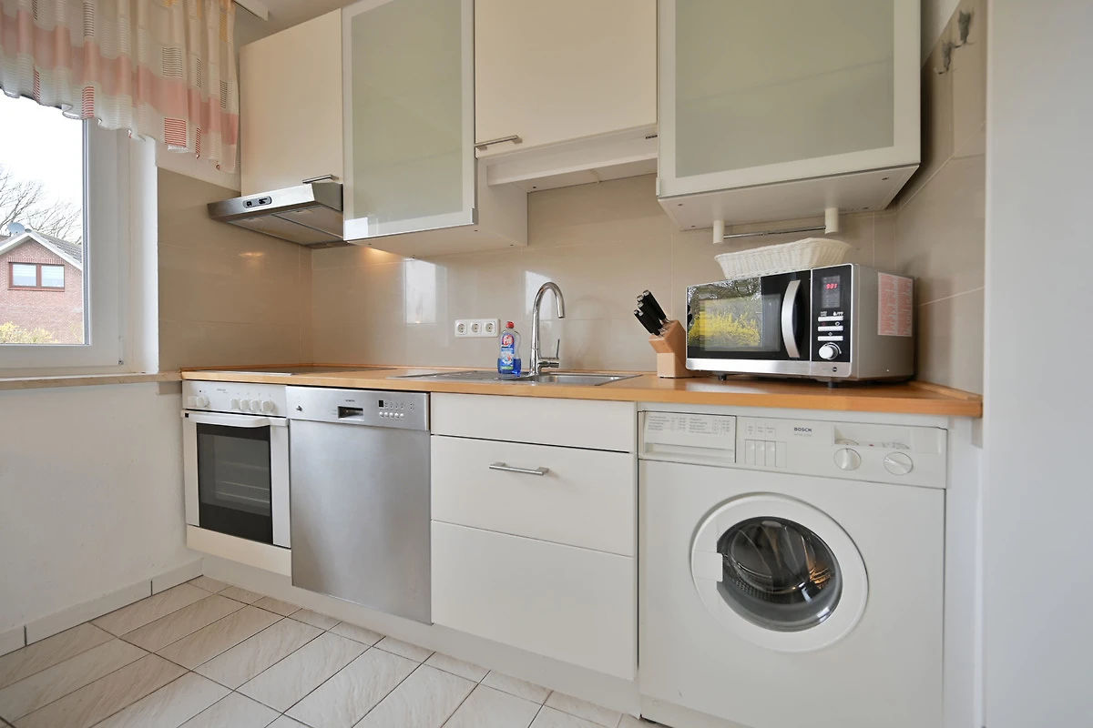 Die Küche mit Essplatz verfügt über eine gute Ausstattung inkl. Waschmaschine, Mikrowelle und Geschirrspülautomat.