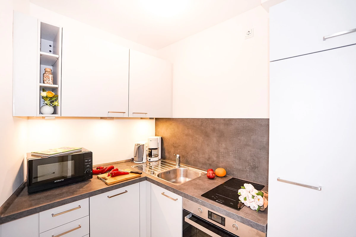 Die separate Küche bietet Ihnen einen Induktionsherd mit 2 Kochfeldern, Backofen, Kühlschrank mit Gefrierfach, Spülmaschine, Mikrowelle und weitere kleine Küchengeräte wie Kaffeemaschine, Wasserkocher und Toaster.