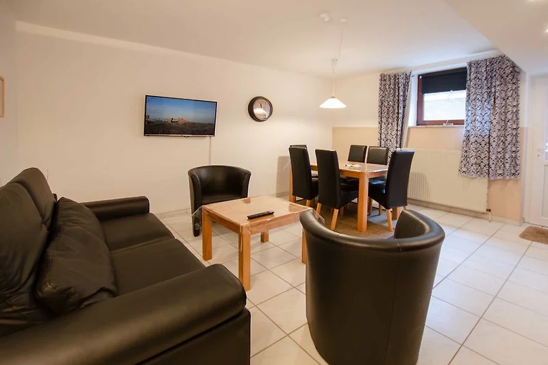 Das schöne Wohnzimmer der Fewo verfügt über ein Schlafsofa, das für zwei Personen geeignet ist, einen Couchtisch und einen Esstisch der für 3 Personen ausgelegt ist.