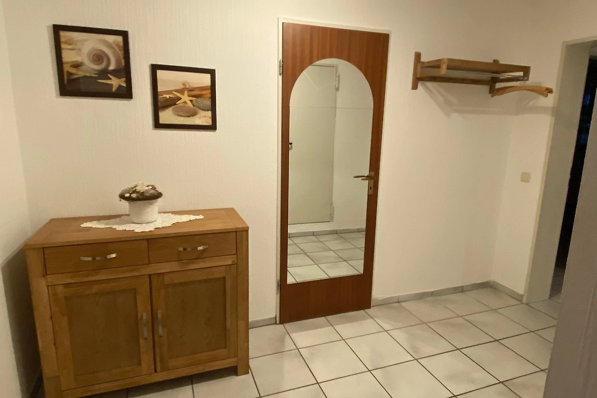 Der Flur ist mit einer Garderobe, einem Spiegel und einem Schuhschrank eingerichtet.
