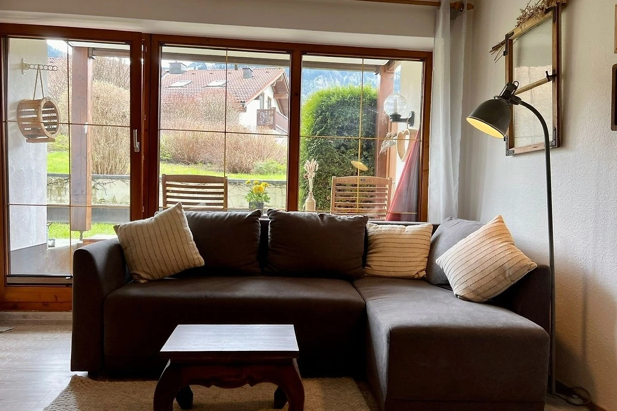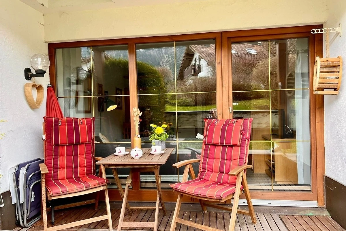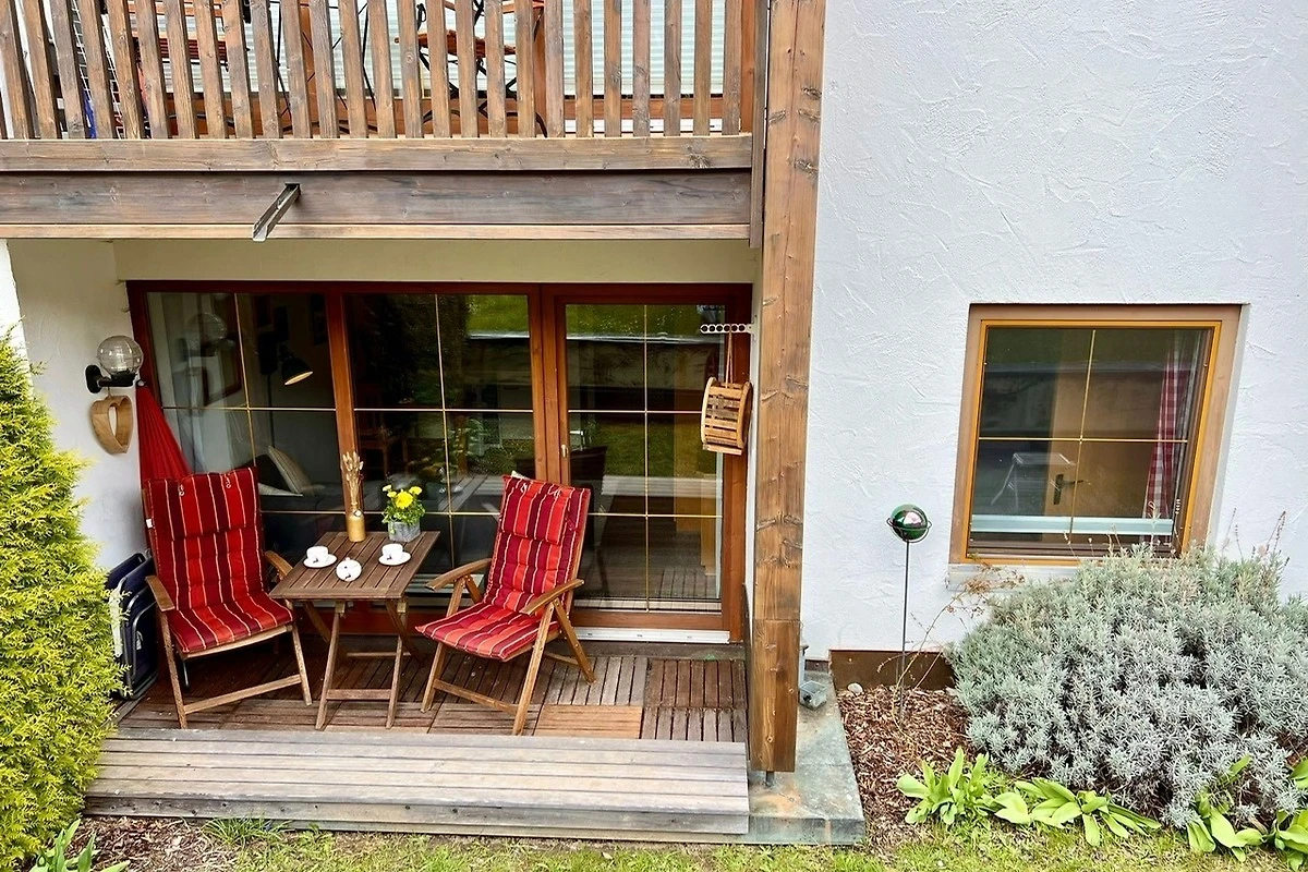 Unsere Ferienwohnung mit Blick auf die Berge ist nach Süden ausgerichtet. Du kannst also fast den ganzen Tag die Sonne auf der Terrasse geniessen. Angrenzend an die Terrasse ist auch ein kleines Rasenstück als Liegefläche vorhanden. Die Waschmaschine und der Trockner befinden sich in einem gemeinschaftlich genutzten Raum im selben Gebäude. Du kannst die Geräte durch Einwurf von Münzen nutzen. Eine Sauna befindet sich im Nebengebäude und ist in den Monaten Oktober bis April an den Wochenenden geöffnet. In der Tiefgarage kannst Du Dein Fahrzeug abstellen, sofern es nicht höher als 1,50 ist. In der Tiefgarage befinden sich auch ein Ski-Keller sowie eine Fahrradgarage. Einkaufsmöglichkeiten für den täglichen Bedarf sind nur wenige Gehminuten entfernt. Wander- und Radwege beginnen unmittelbar vor Deiner Haustür.