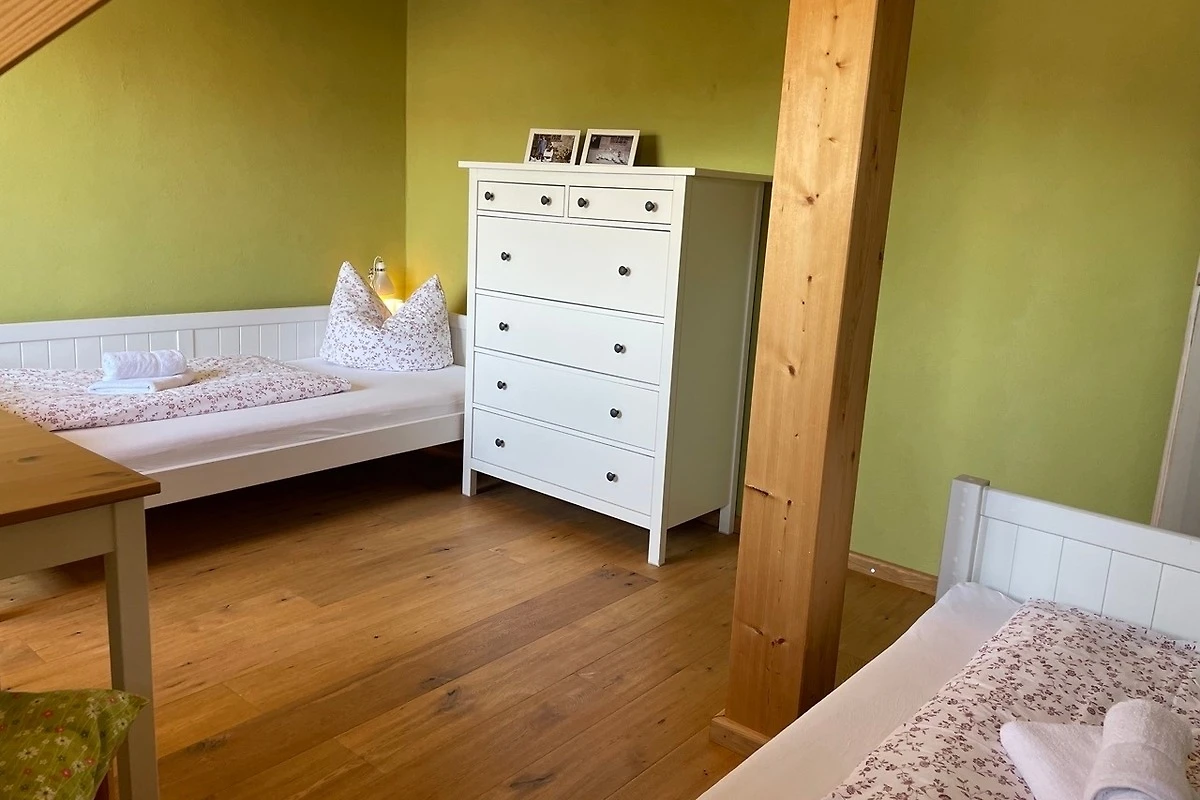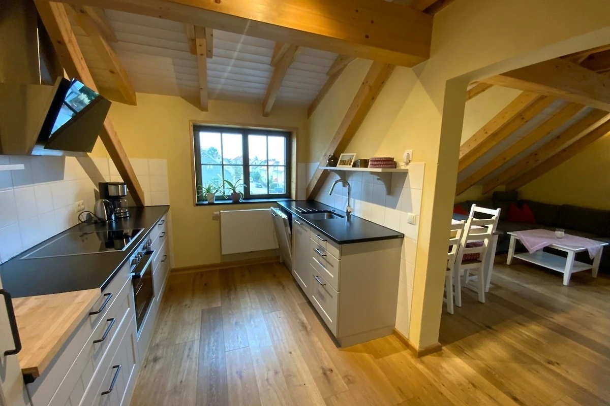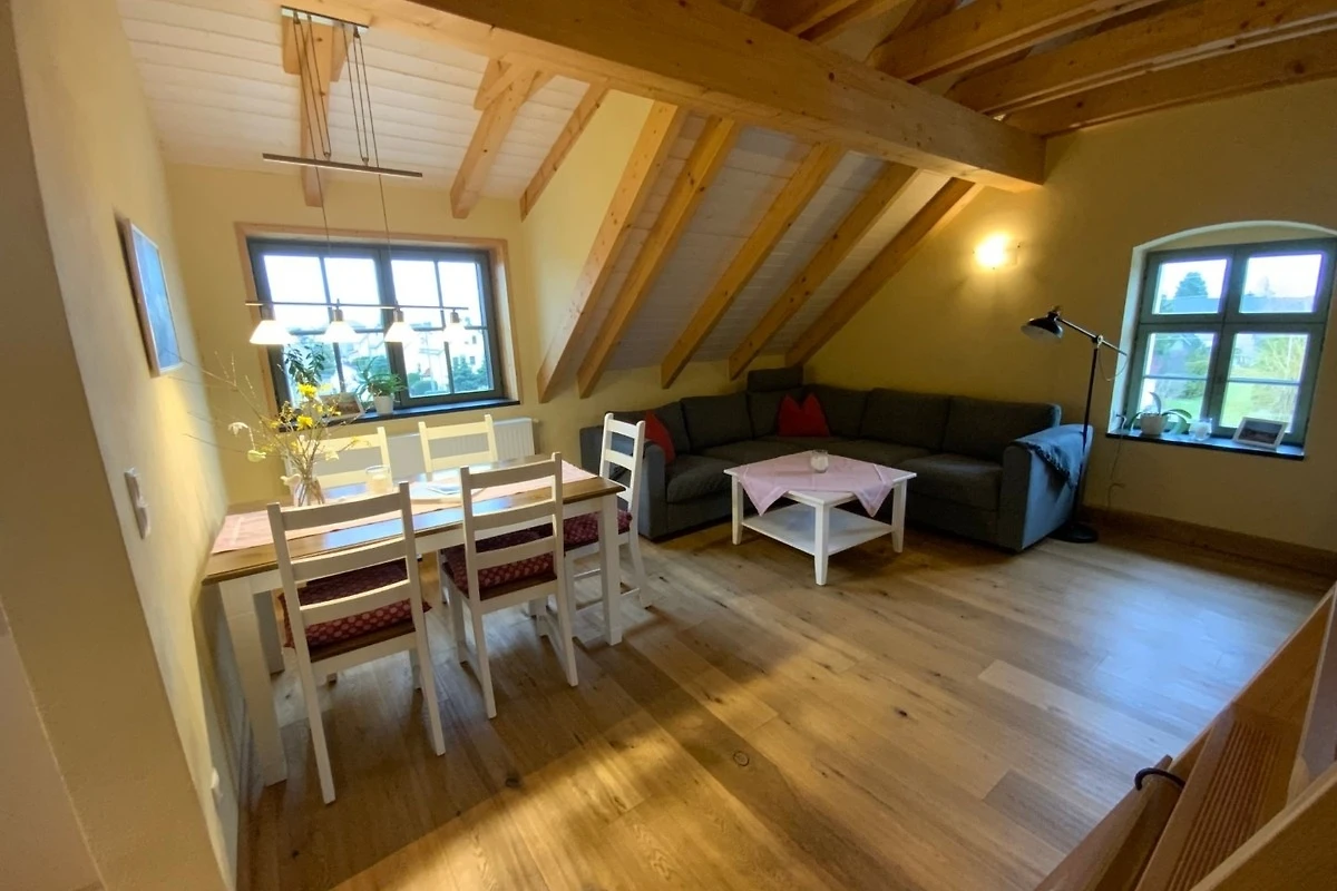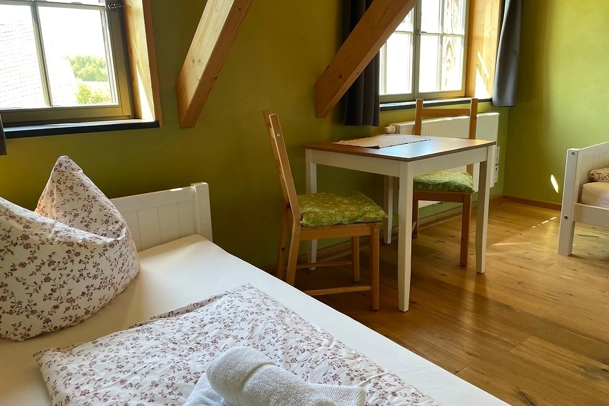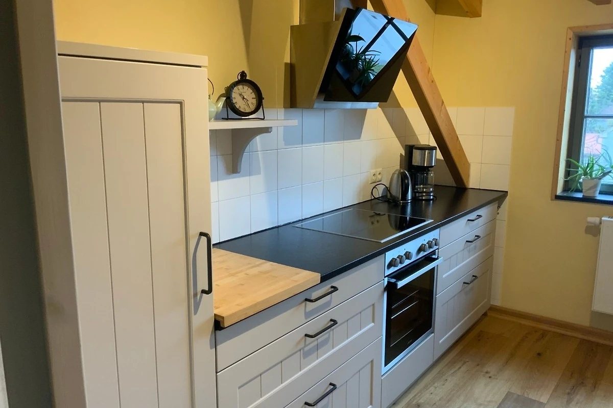 Die Kutscherstuben befinden sich im Dachgeschoss und bieten Platz für 4 Personen. Hier steht Ihnen eine Küche mit offenem Übergang zum Wohnbereich zur Verfügung. Die Küche ist mit Herd, Geschirrspüler, Kühlschrank, Kaffeemaschine, Wasserkocher, Toaster und vielem mehr voll ausgestattet. Desweiteren gehören zur Wohnung ein Schlafzimmer mit Doppelbett, ein Kinderzimmer mit zwei Einzelbetten, ein Spielboden sowie ein Bad mit WC und Dusche. Durch die ökologische Bauweise mit Holz, Lehm und Naturdämmstoffen herrscht hier zu jeder Jahreszeit ein sehr angenehmes Wohnklima. Dort wo unsere Vorfahren Zimmer für die Kutscher planten, entspannen Sie heute mit Ausblick ins Oberlausitzer Bergland.