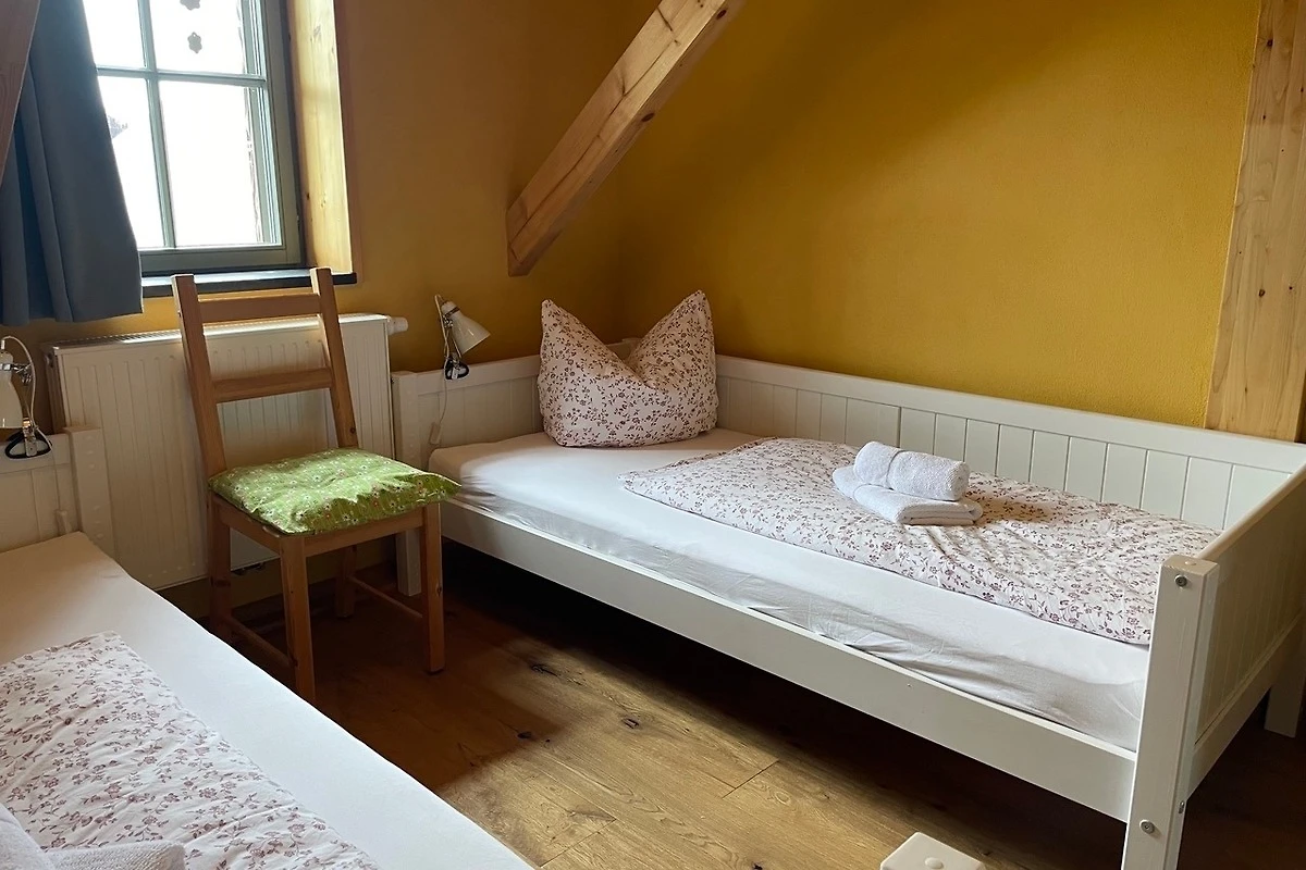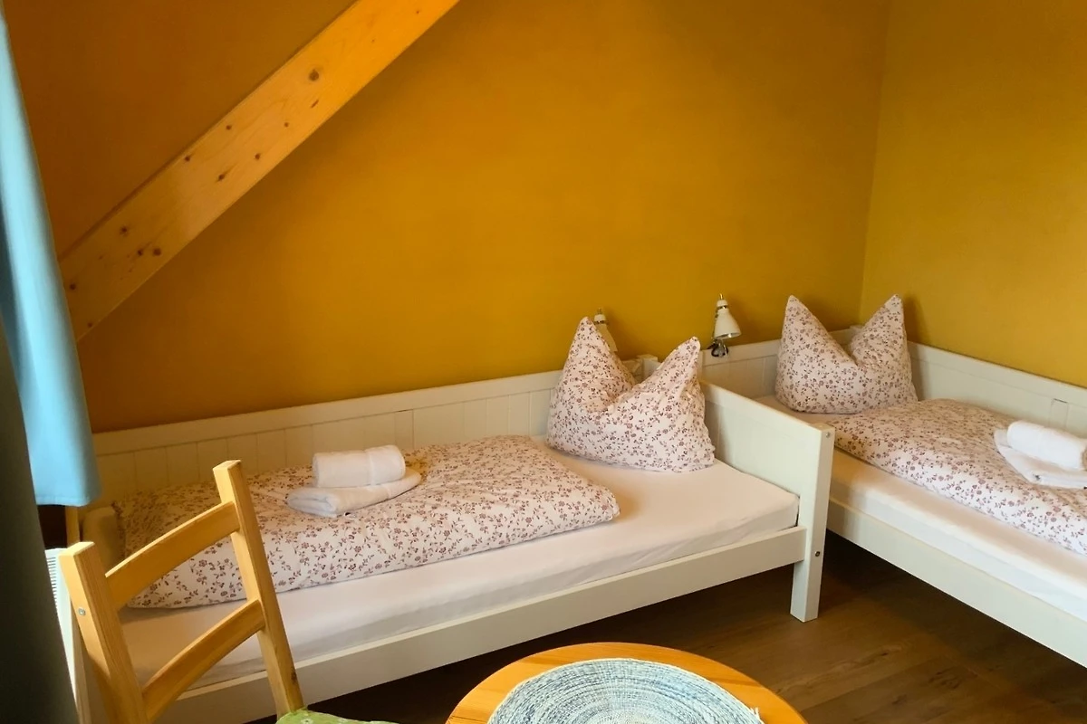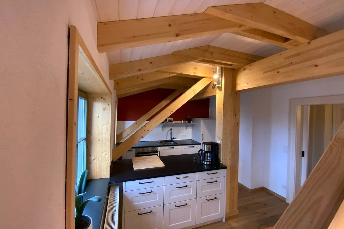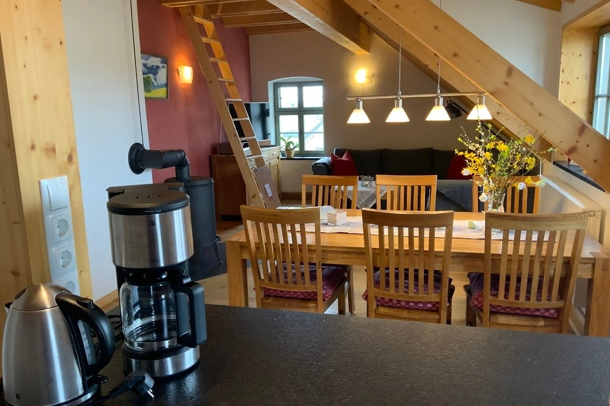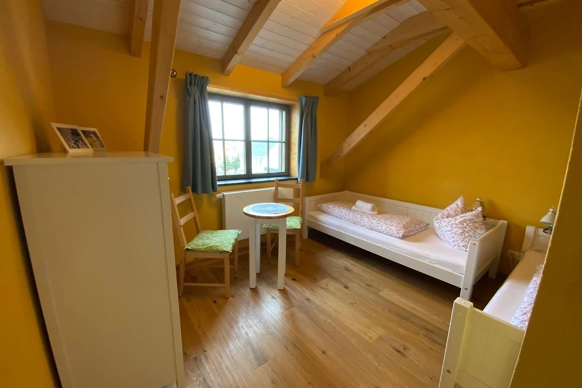 Die Kornkammer befindet sich im Dachgeschoss und bietet Platz für 6 Personen. Hier steht Ihnen eine grosse Wohnküche mit Essbereich zur Verfügung. Die Küche ist mit Herd, Geschirrspüler, Kühlschrank, Kaffeemaschine, Wasserkocher, Toaster und vielem mehr voll ausgestattet. Desweiteren gehören zur Wohnung ein Schlafzimmer mit Doppelbett, zwei Kinderzimmer mit je 2 Einzelbetten, ein Spielboden sowie ein Bad mit WC und Dusche. Durch die ökologische Bauweise mit Holz, Lehm und Naturdämmstoffen herrscht hier zu jeder Jahreszeit ein sehr angenehmes Wohnklima. Dort wo früher das Korn gelagert war, laden wir Sie ein von weiten Feldern und Wiesen zu träumen.