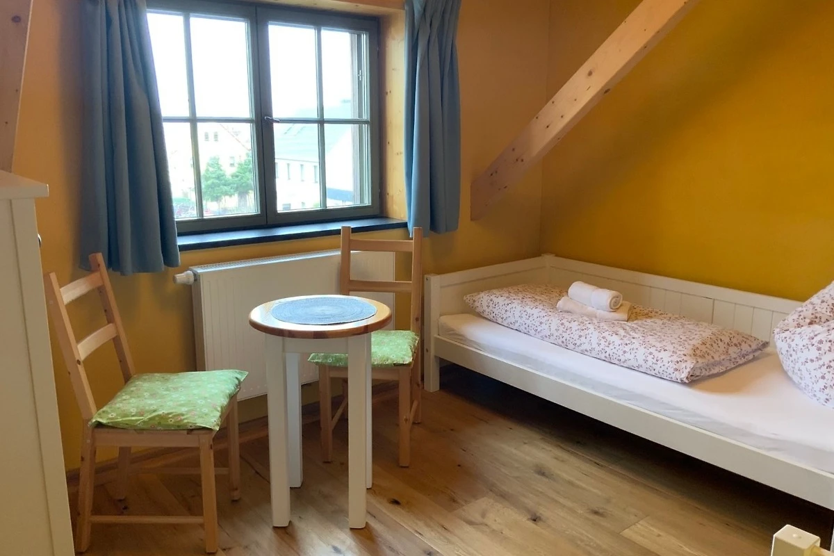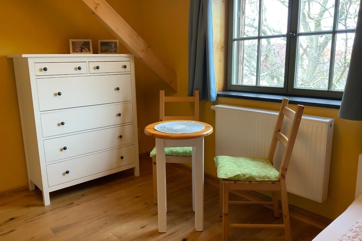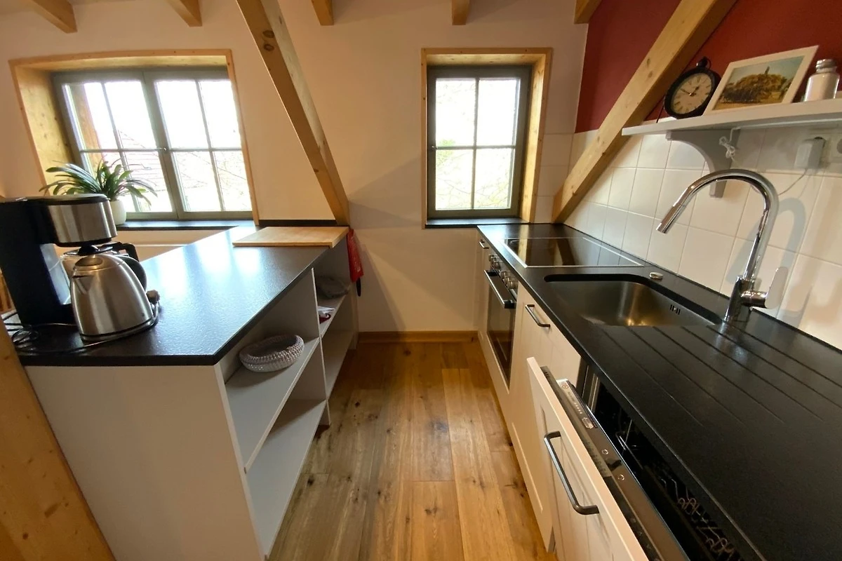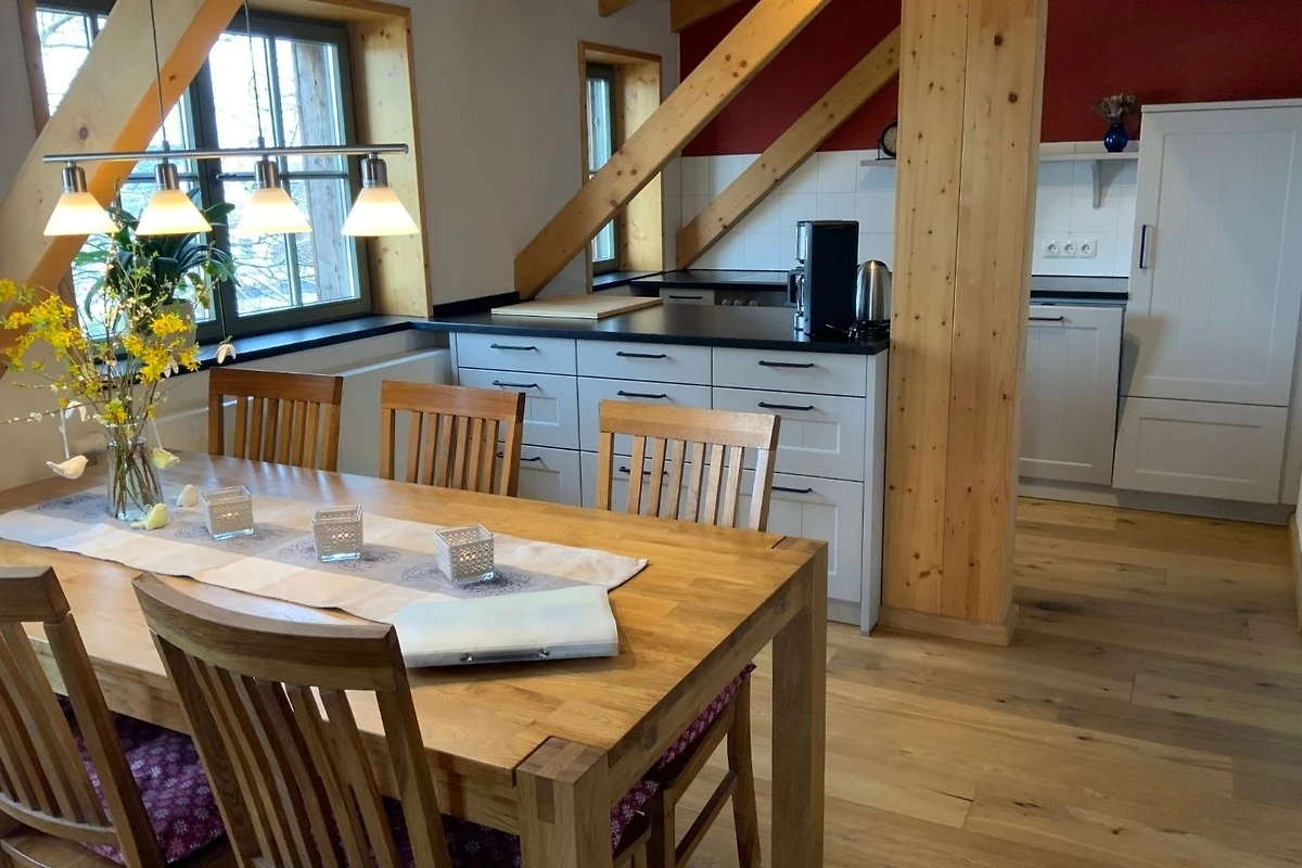 Die Kornkammer befindet sich im Dachgeschoss und bietet Platz für 6 Personen. Hier steht Ihnen eine grosse Wohnküche mit Essbereich zur Verfügung. Die Küche ist mit Herd, Geschirrspüler, Kühlschrank, Kaffeemaschine, Wasserkocher, Toaster und vielem mehr voll ausgestattet. Desweiteren gehören zur Wohnung ein Schlafzimmer mit Doppelbett, zwei Kinderzimmer mit je 2 Einzelbetten, ein Spielboden sowie ein Bad mit WC und Dusche. Durch die ökologische Bauweise mit Holz, Lehm und Naturdämmstoffen herrscht hier zu jeder Jahreszeit ein sehr angenehmes Wohnklima. Dort wo früher das Korn gelagert war, laden wir Sie ein von weiten Feldern und Wiesen zu träumen.