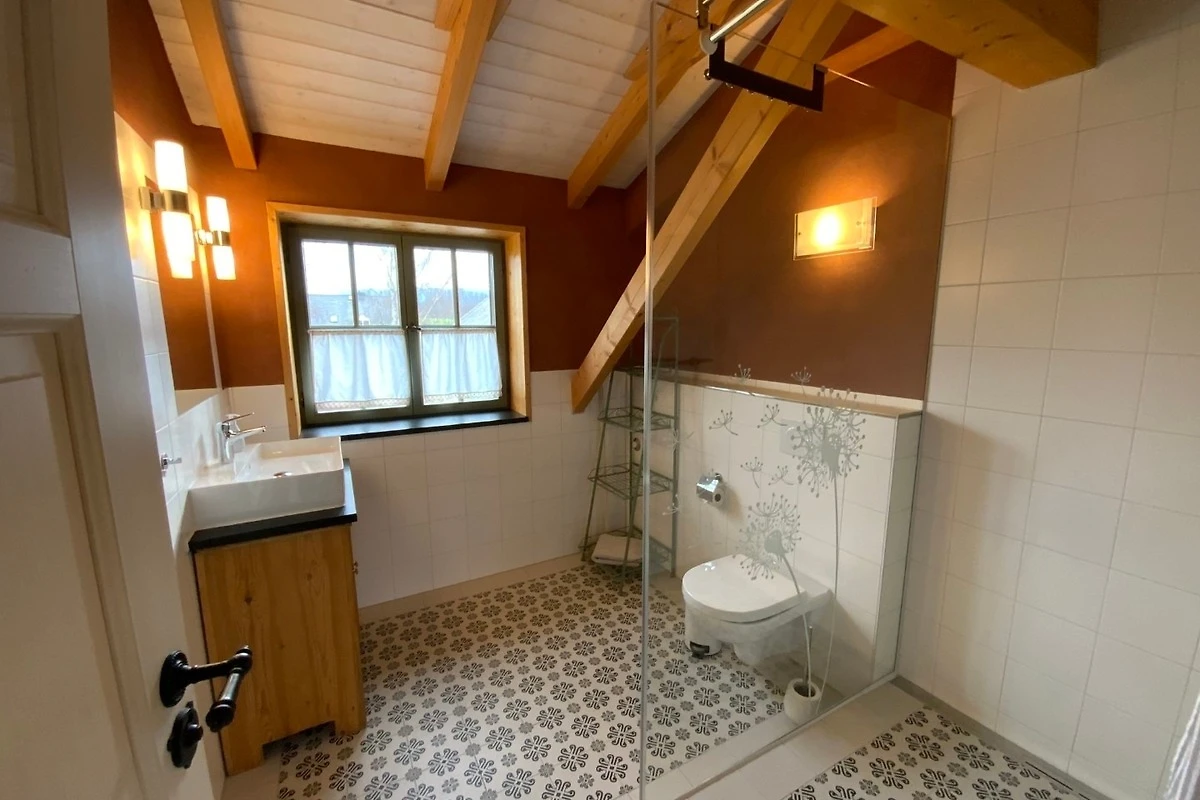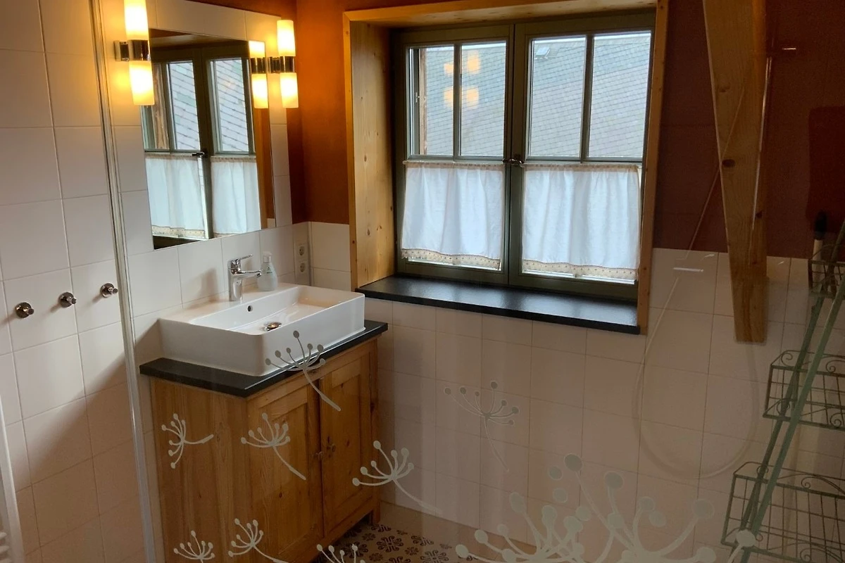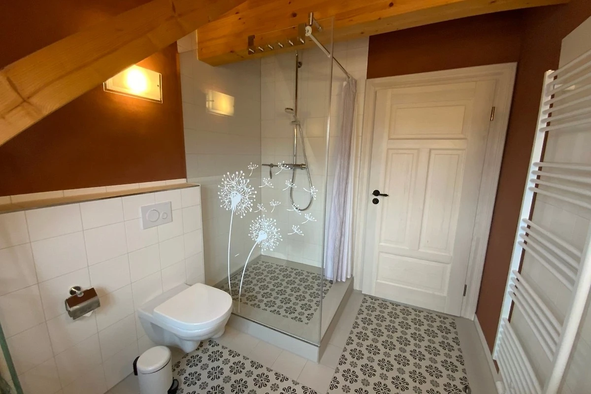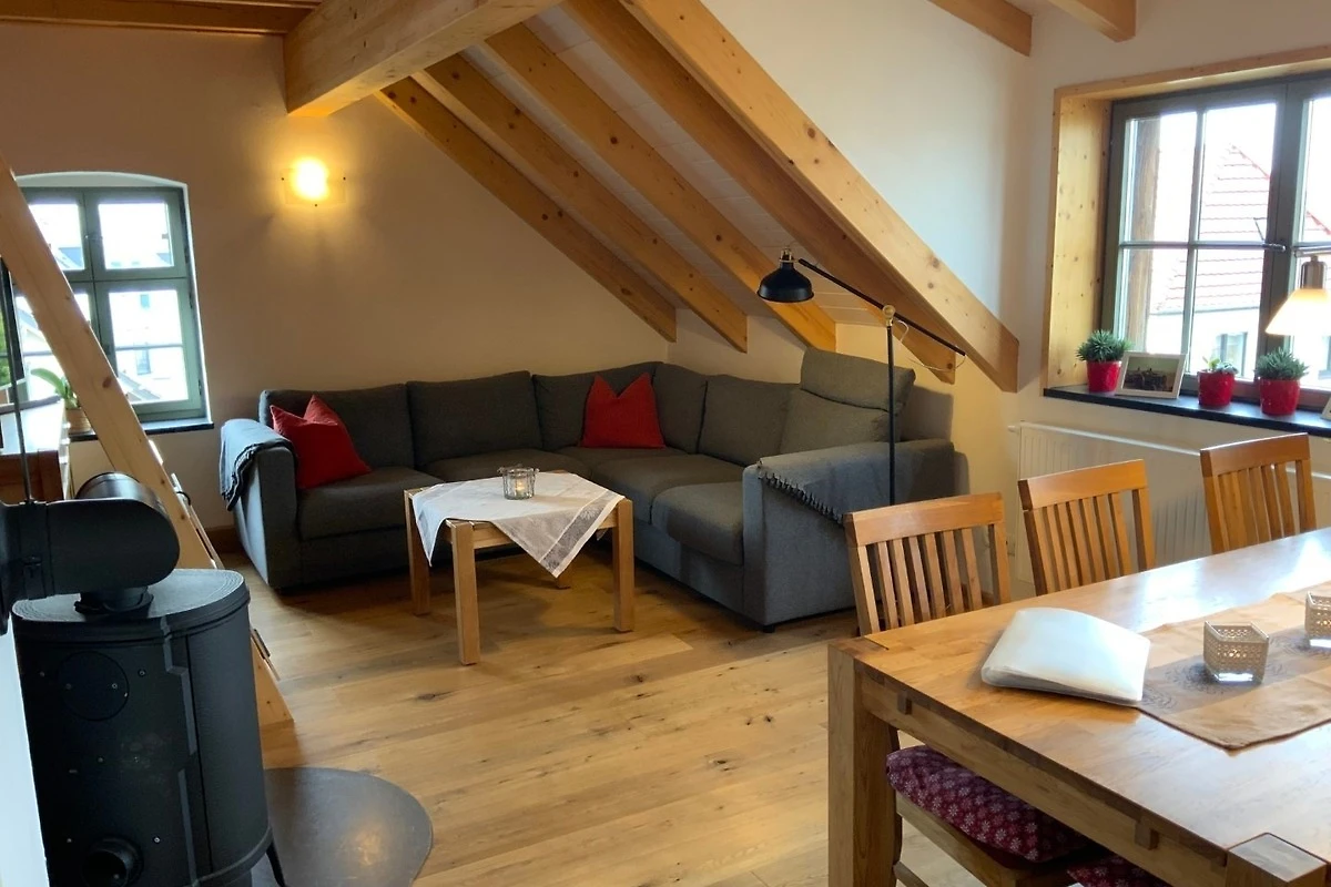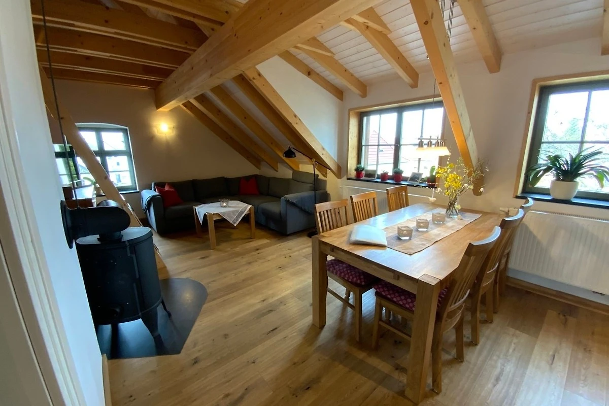 Die Kornkammer befindet sich im Dachgeschoss und bietet Platz für 6 Personen. Hier steht Ihnen eine grosse Wohnküche mit Essbereich zur Verfügung. Die Küche ist mit Herd, Geschirrspüler, Kühlschrank, Kaffeemaschine, Wasserkocher, Toaster und vielem mehr voll ausgestattet. Desweiteren gehören zur Wohnung ein Schlafzimmer mit Doppelbett, zwei Kinderzimmer mit je 2 Einzelbetten, ein Spielboden sowie ein Bad mit WC und Dusche. Durch die ökologische Bauweise mit Holz, Lehm und Naturdämmstoffen herrscht hier zu jeder Jahreszeit ein sehr angenehmes Wohnklima. Dort wo früher das Korn gelagert war, laden wir Sie ein von weiten Feldern und Wiesen zu träumen.
