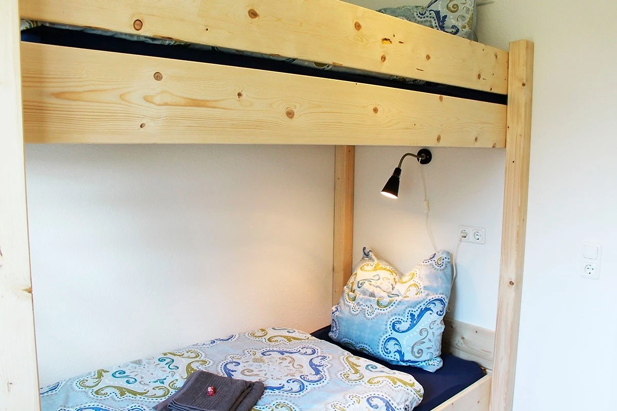 Alle Zimmer befinden sich im Erdgeschoss. Neben dem grosszügigen Wohnzimmer mit Essecke und offener Küche gibt es 2 Schlafzimmer und ein modernes Bad (Dusche/WC) mit Fussbodenheizung. Ein Schlafzimmer verfügt über ein Doppelbett, das andere über ein sehr stabiles, vom Zimmermann gebautes Hochbett, das Kinder wie Erwachsene gut verträgt.