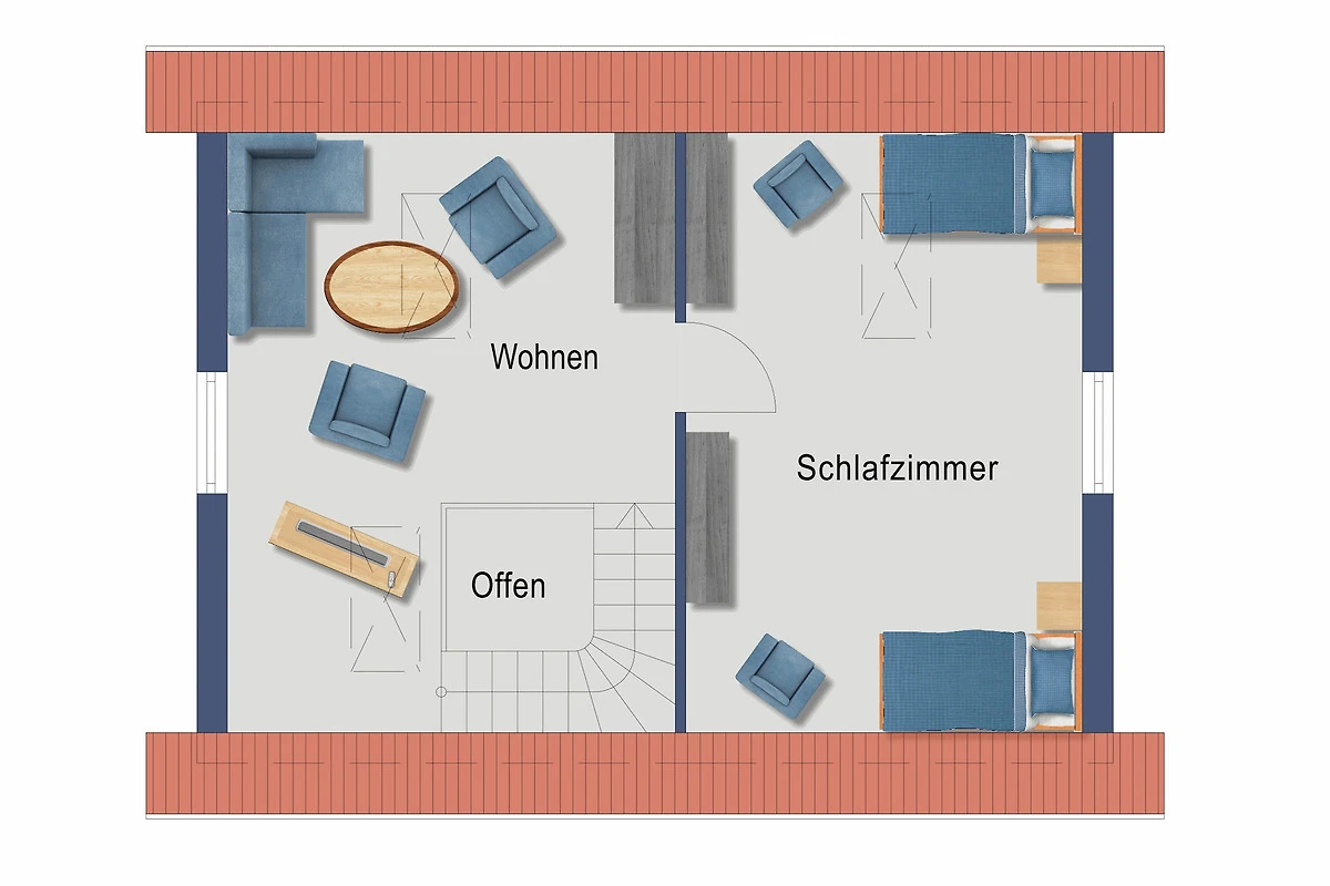 Im Obergeschoss kann man es sich im Wohnbereich auf dem Sofa gemütlich machen, fernsehen, lesen, Musik hören, spielen oder einfach klönen. Im Schlafzimmer stehen zwei Einzelbetten.