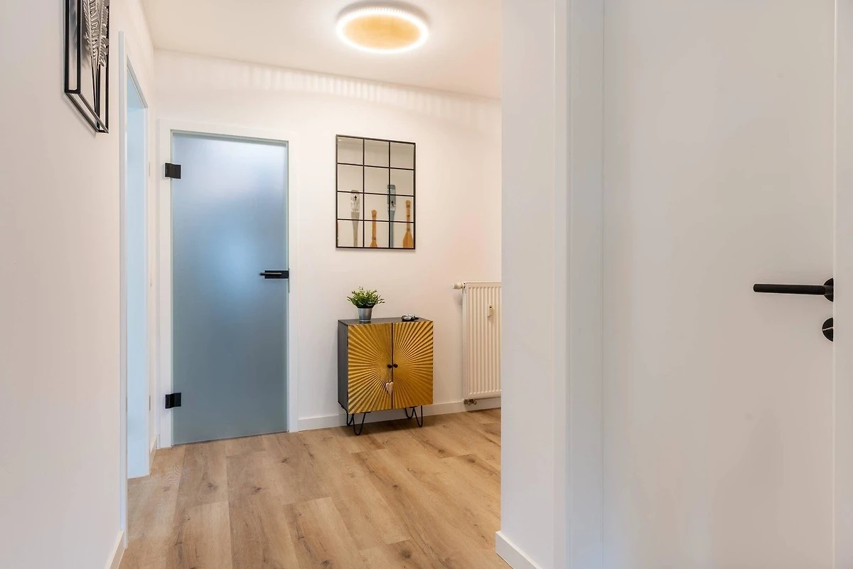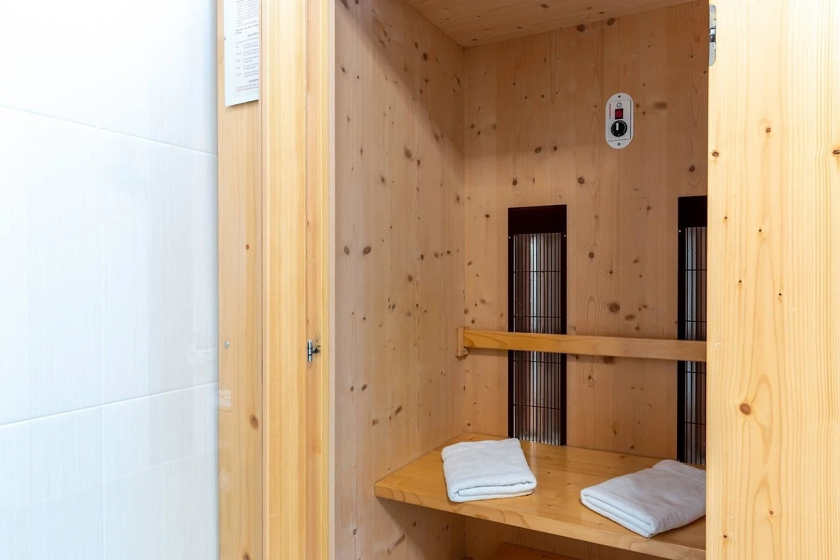 Im modernen Bad mit Tageslicht haben Sie eine Dusche sowie eine Elektrosauna, WC und Waschbecken. Im Abstellraum des Apartments können Sie eine Waschmaschine nutzen.