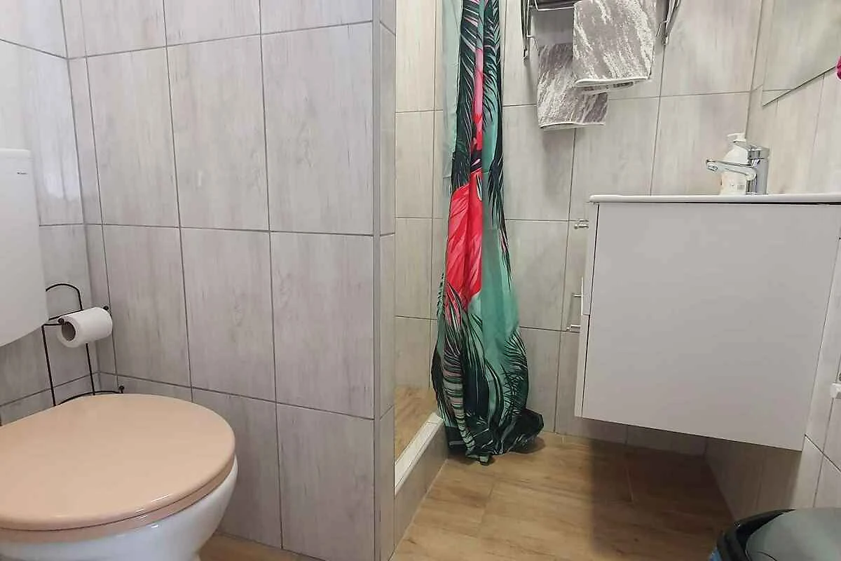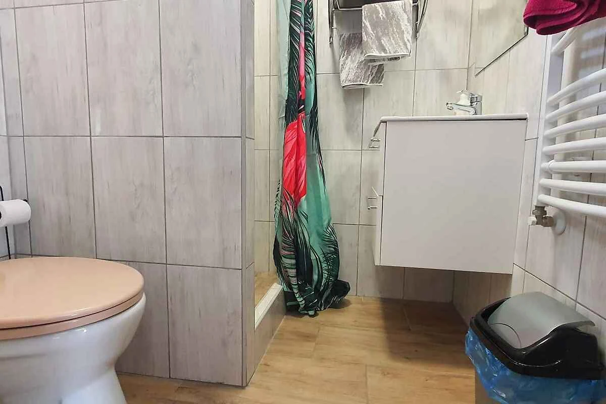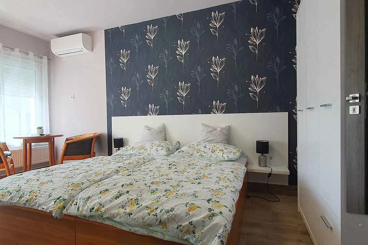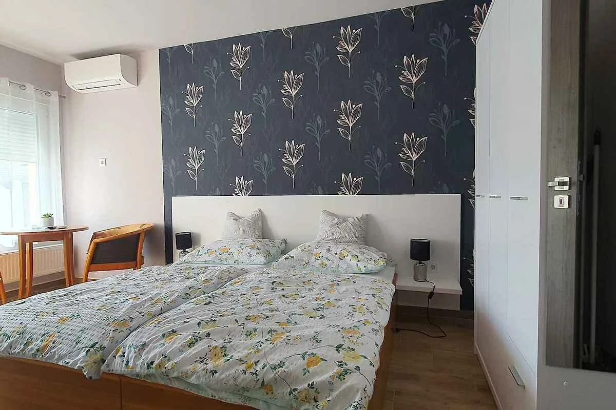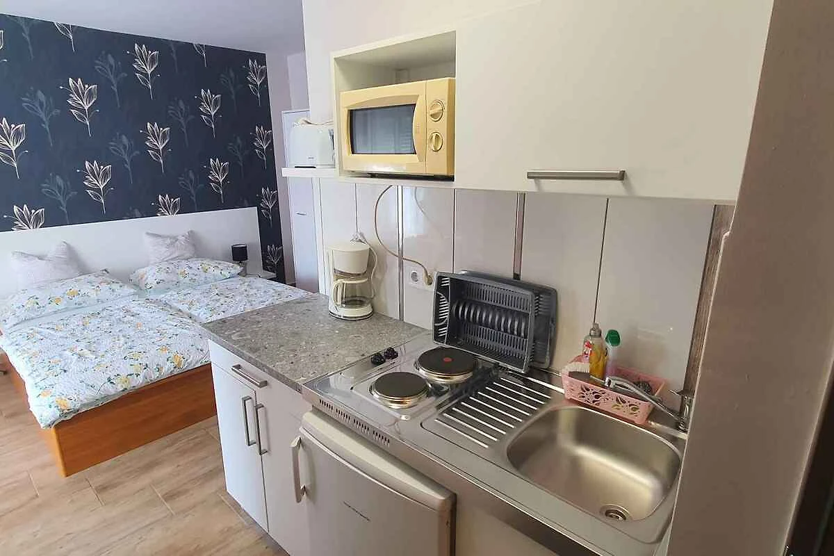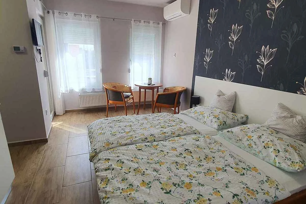 Hévíz. Das Studio befindet sich auf einem 600 qm grossen, geschlossenen Gartengrundstück mit Blumen, Sträuchern und Bäumen, von einem Zaun begrenzt. Der Vermieter wohnt nur zeitweise im Haus, nutzt jedoch einen separaten Eingang. Die Zufahrt erfolgt über eine Nebenstrasse (asphaltiert). Parkplatz (für 1 Pkw) auf dem Grundstück.