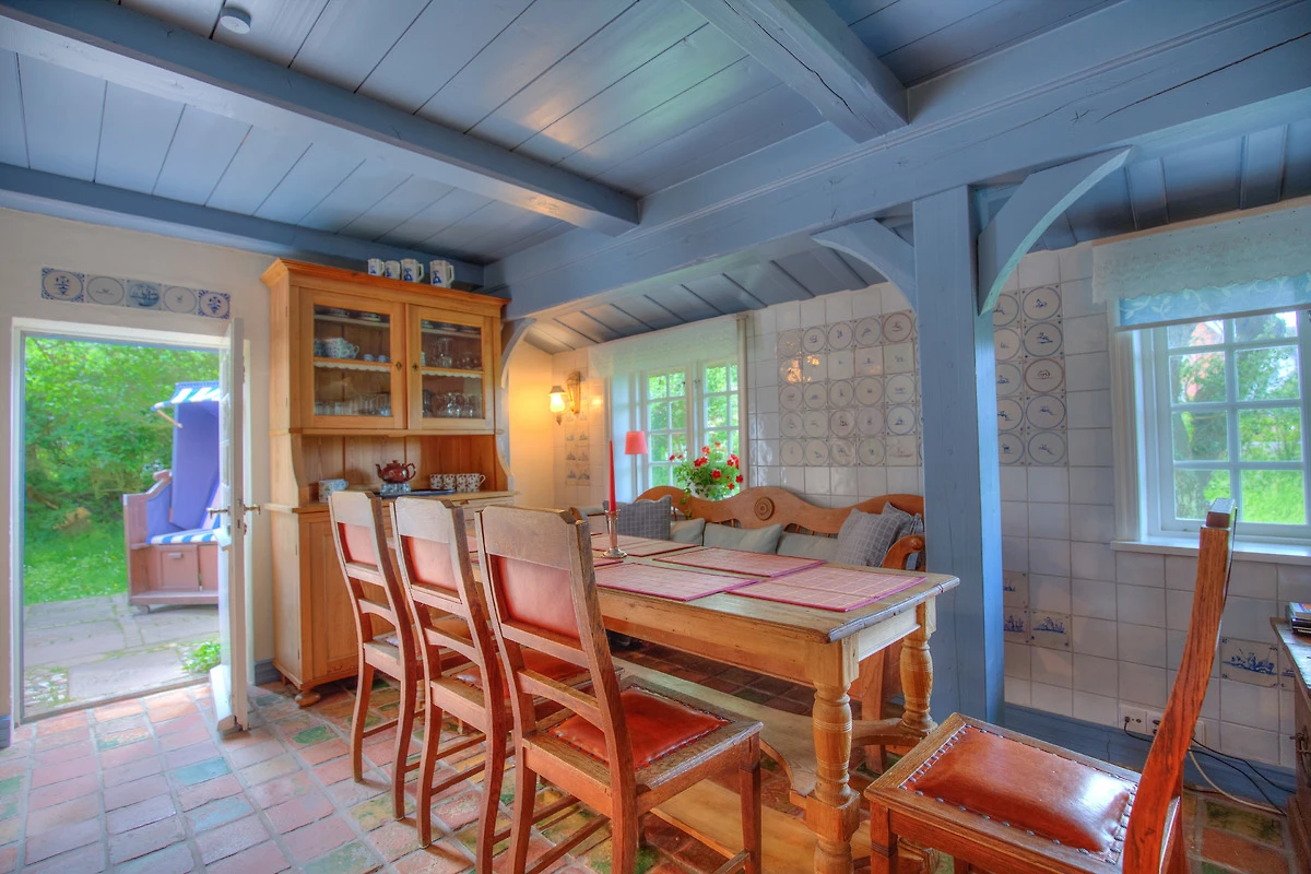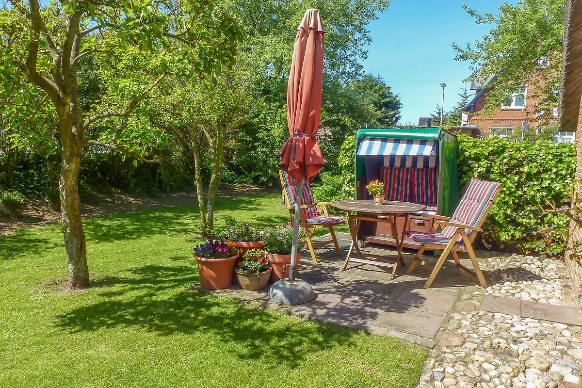 Aus dem Wohnzimmer heraus gelangen sie durch die „Brauttür“ direkt zu Ihrem eigenen nach Süden gerichteten Terrassenbereich mit Strandkorb, Sonnenschirm und Gartenmöbeln – beste Möglichkeiten, um besondere Momente mit der Familie zu verbringen. Die beiden anheimelnden Schlafräume mit Doppelbetten im Erdgeschoss versprechen erholsame Nächte und bieten genug Schrankraum.