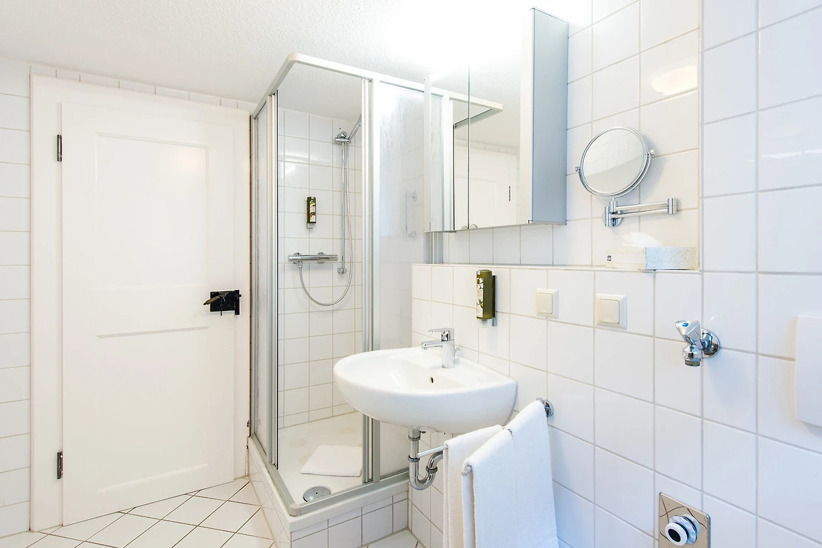 separates Badezimmer, Dusche, Föhn und Kosmetikspiegel