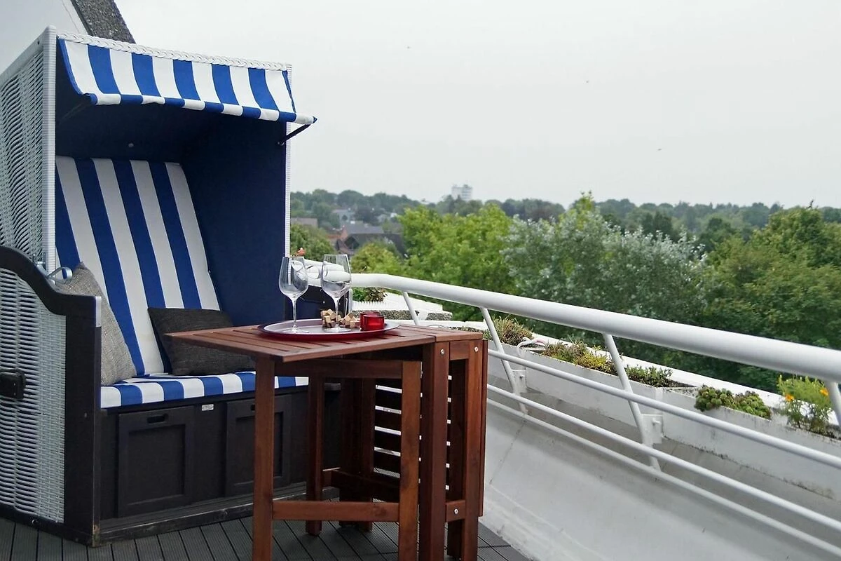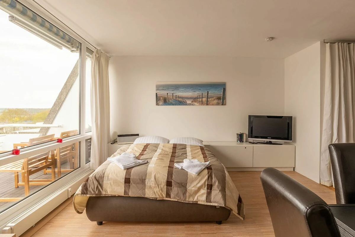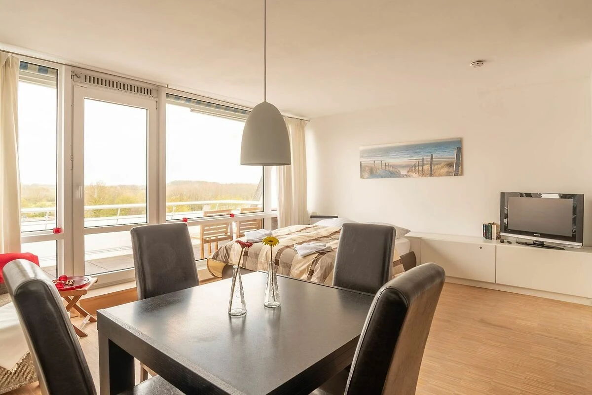 Die 46qm grosse Ferienwohnung liegt im dritten Stock der Appartement-Anlage Fliegender Holländer. Sie verfügt über einen 12qm grossen Balkon (mit Markise) in südwestlicher Lage, so dass Sie auch abends die Sonne in vollen Zügen im Strandkorb oder auf den 2 Stühlen mit Tisch geniessen können. Der Wohnbereich ist mit einem Parkettfussboden ausgelegt und geschmackvoll eingerichtet. Es steht Ihnen ein Ecksofa als Sitzgelegenheit zur Verfügung, welches zusätzlich für eine dritte Person zur Schlafcouch umgebaut werden kann. Das Bett hat die Masse 140 x 200. Das Appartement verfügt über einen Fernseher (mit Kabel-TV) und ein Radio.