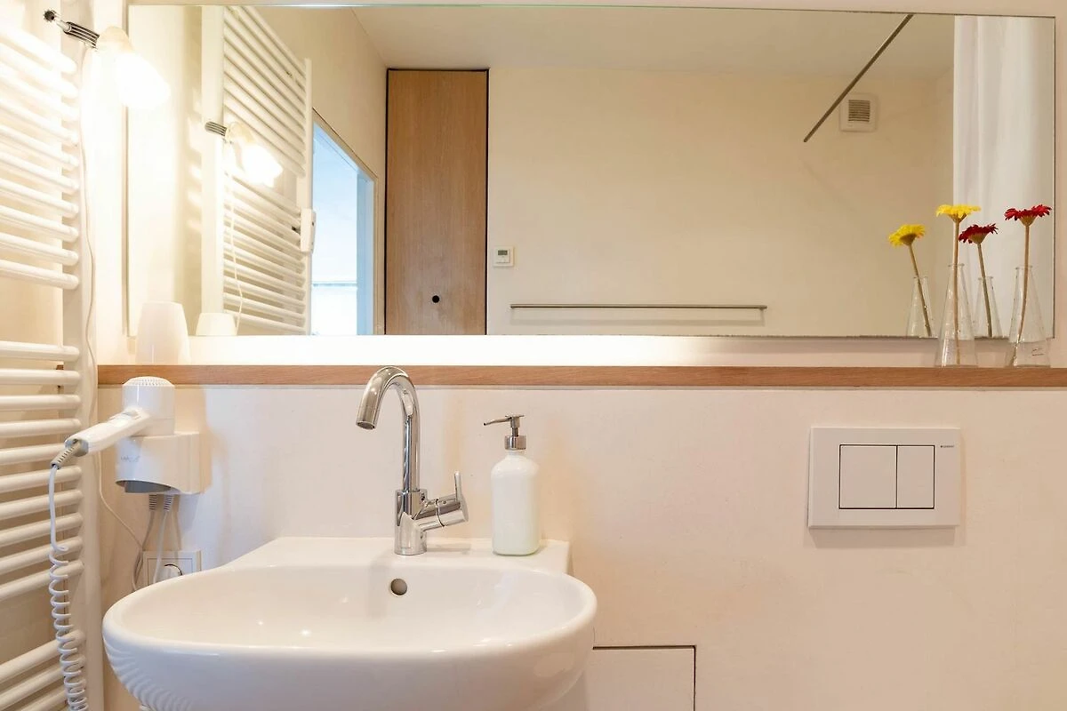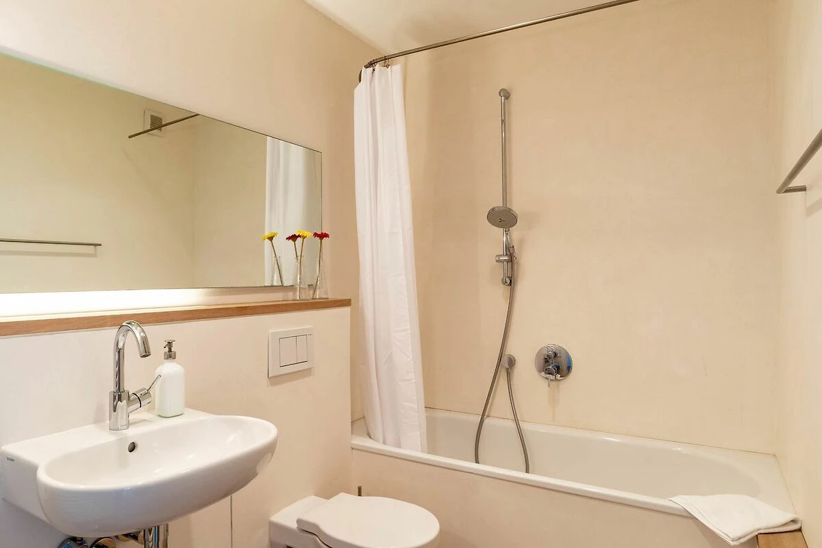 Die Wohnung ist mit einem Wannenbad ausgestattet. Im grossen Wandschrank befindet sich ausreichend Platz für Ihre Kleidung. Zusätzlich ist hier eine Waschmaschine integriert.