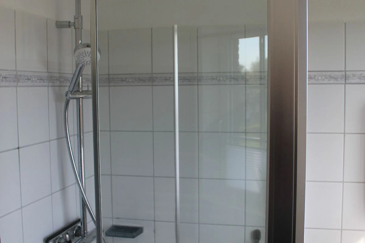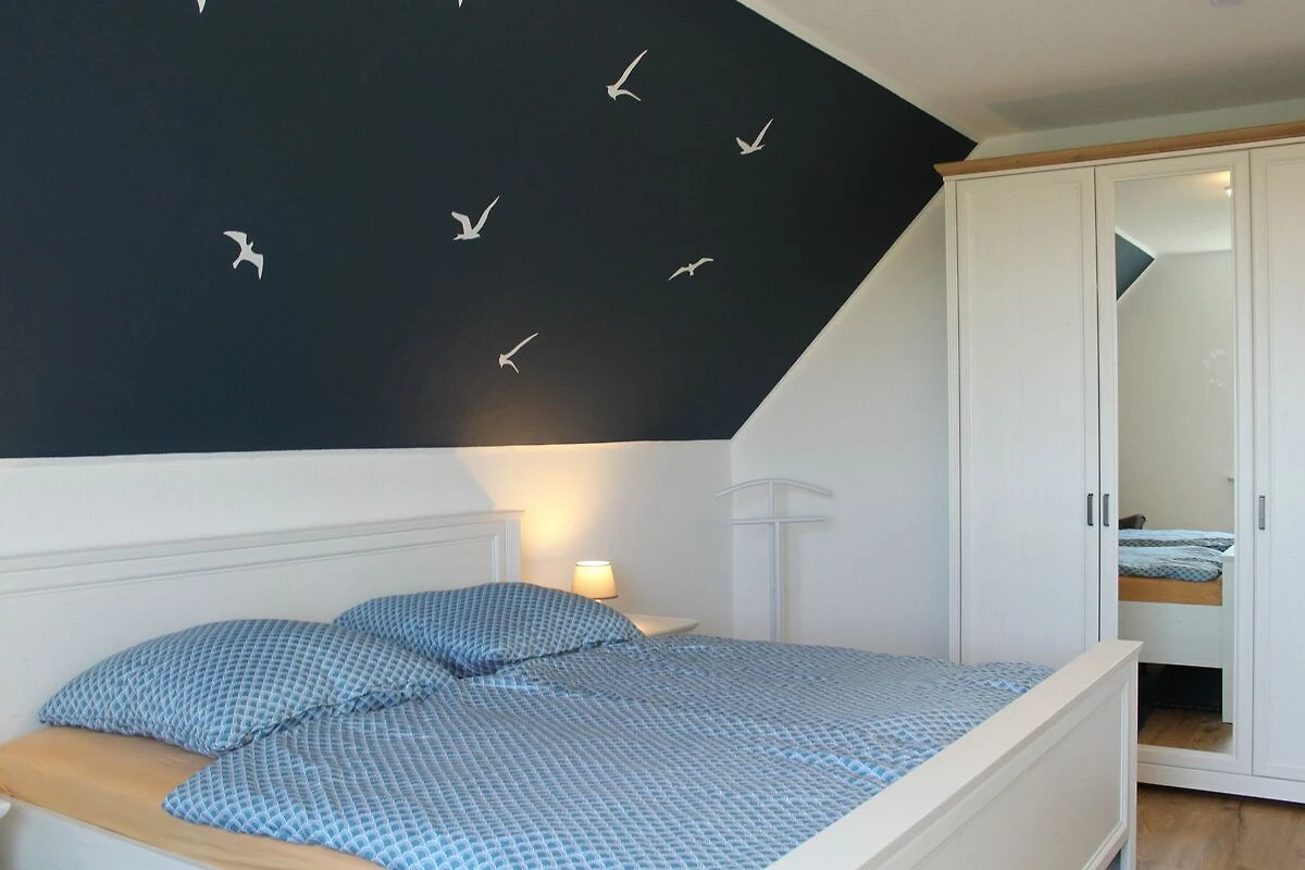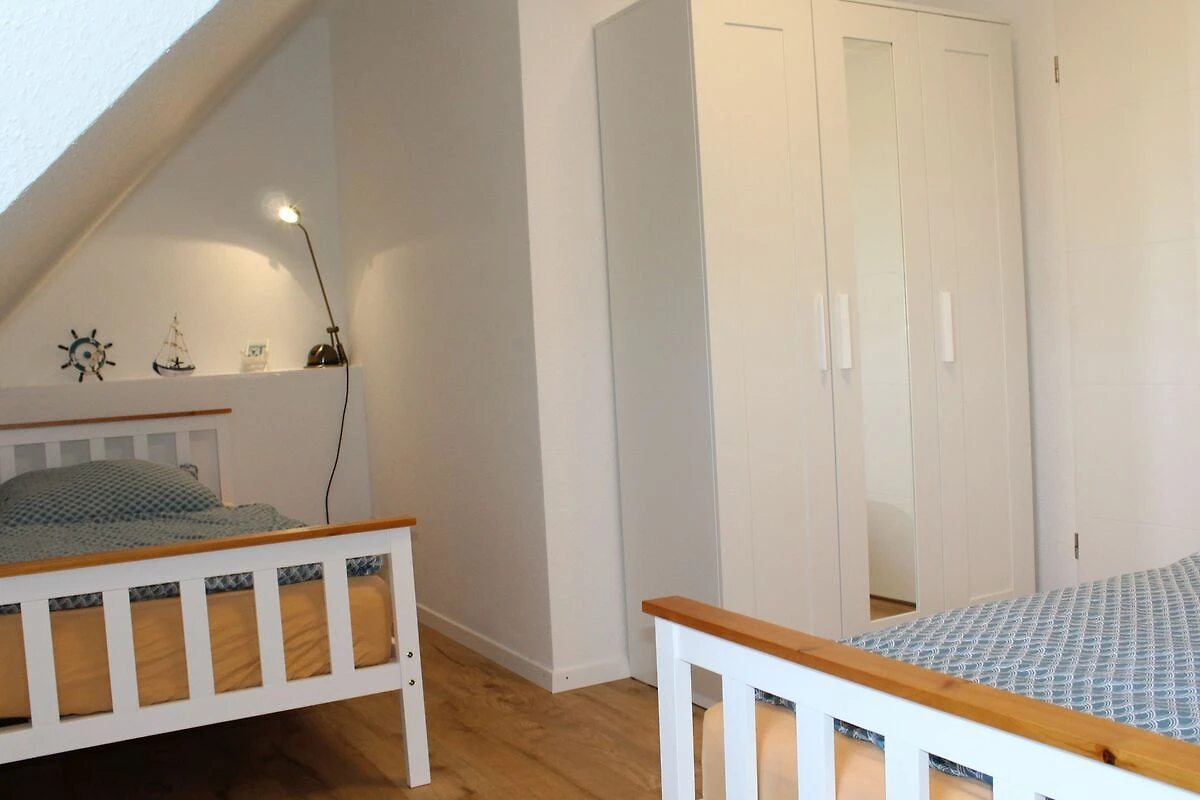 Im Obergeschoss befinden sich die beiden Schlafzimmer, eines mit Doppelbett (180x200cm) und eines mit zwei Einzelbetten (90x200cm) und das Duschbad mit Walk-In-Dusche.