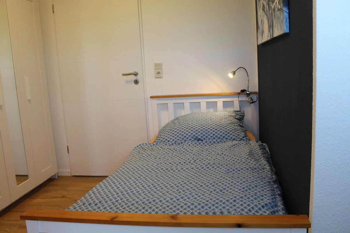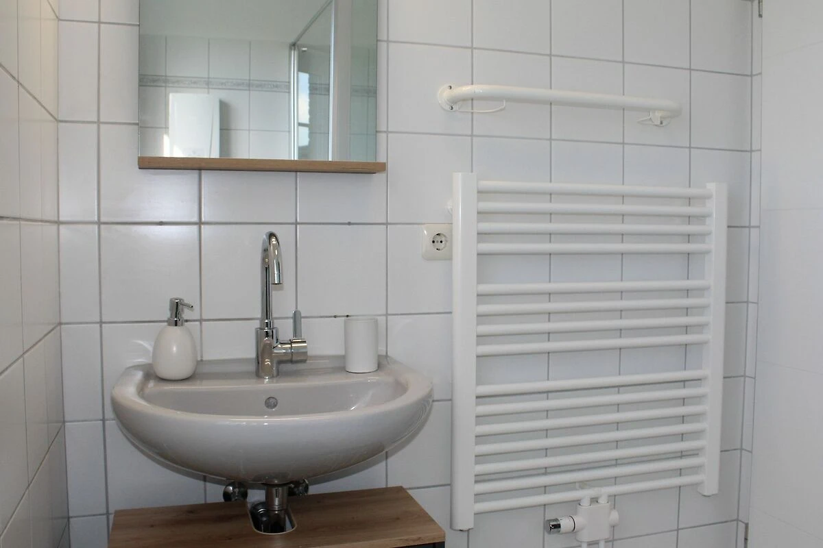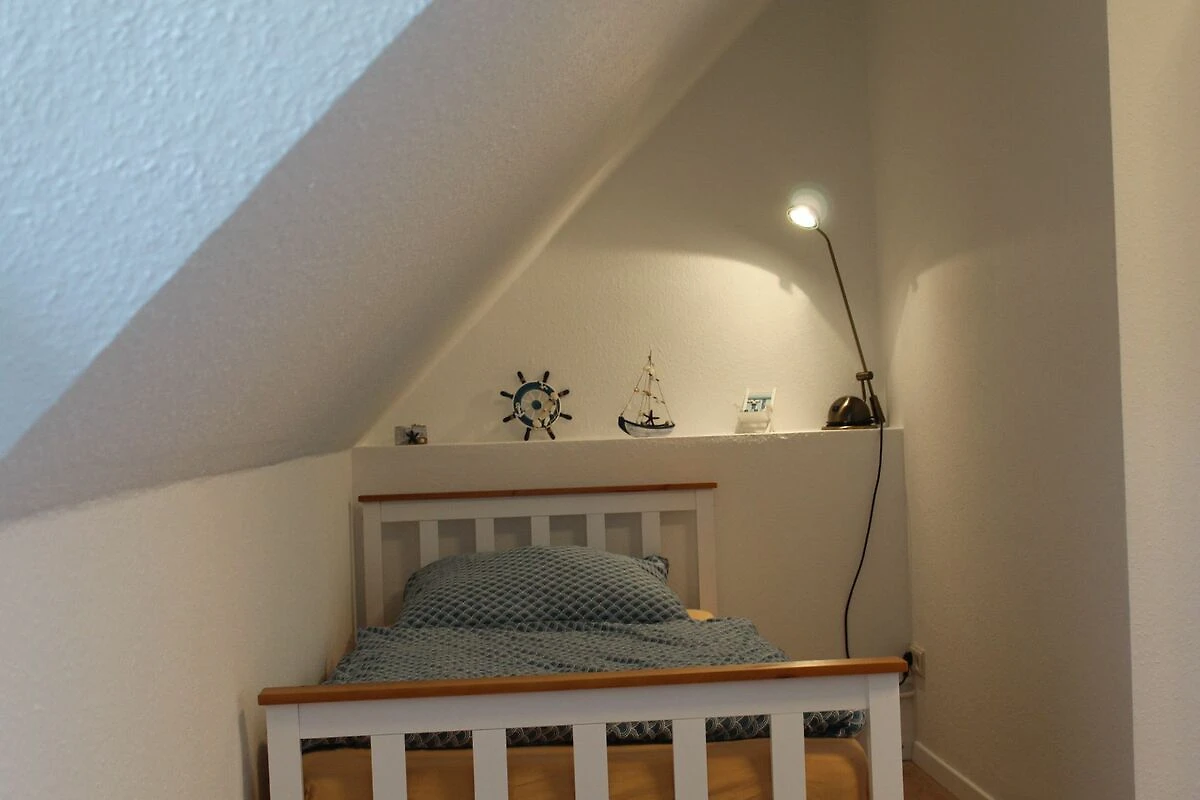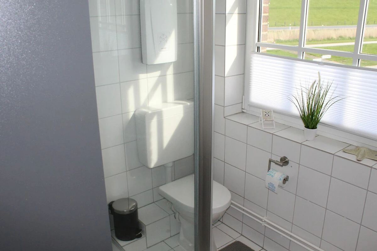 Im Obergeschoss befinden sich die beiden Schlafzimmer, eines mit Doppelbett (180x200cm) und eines mit zwei Einzelbetten (90x200cm) und das Duschbad mit Walk-In-Dusche.