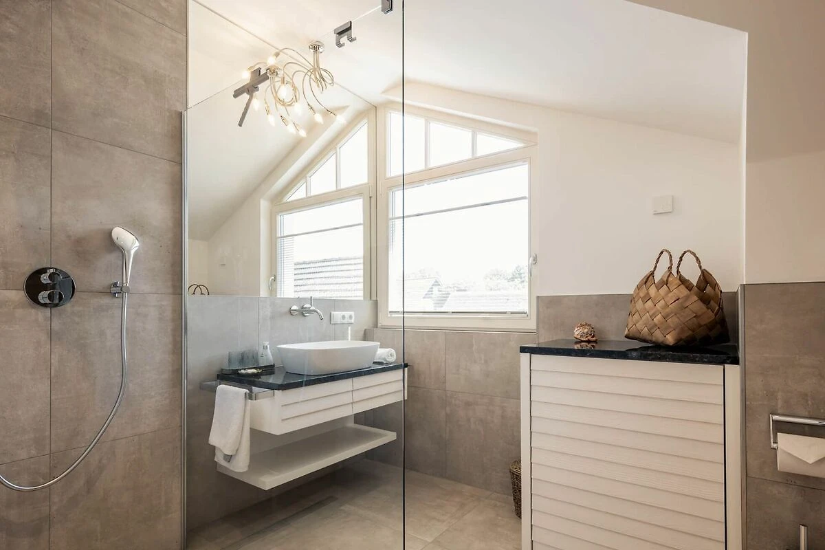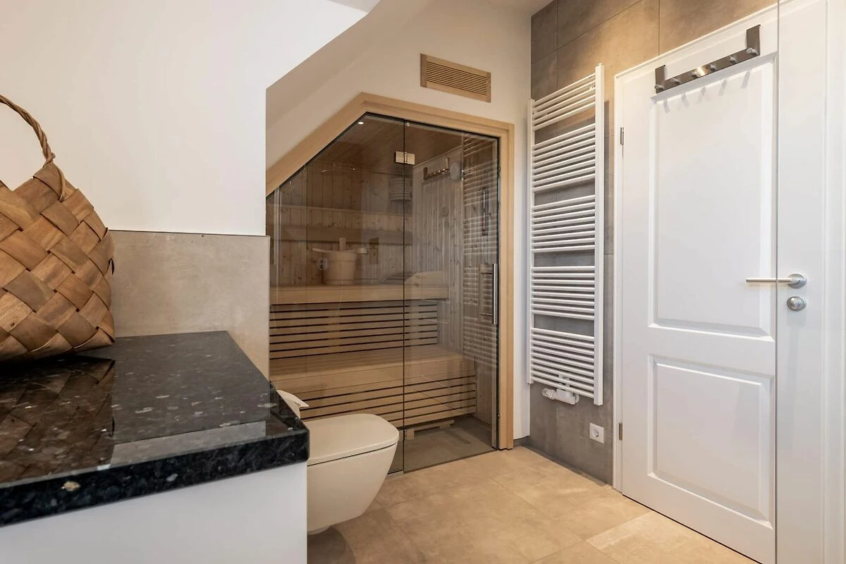 Zusätzlich erwartet Sie im Obergeschoss ein zweites elegantes Badezimmer mit Dusche, voll verglaster Sauna und Waschmaschine.