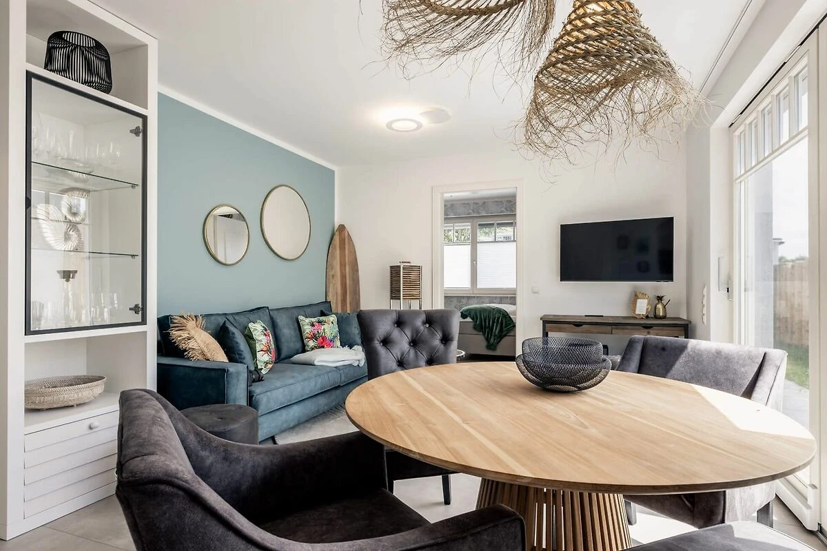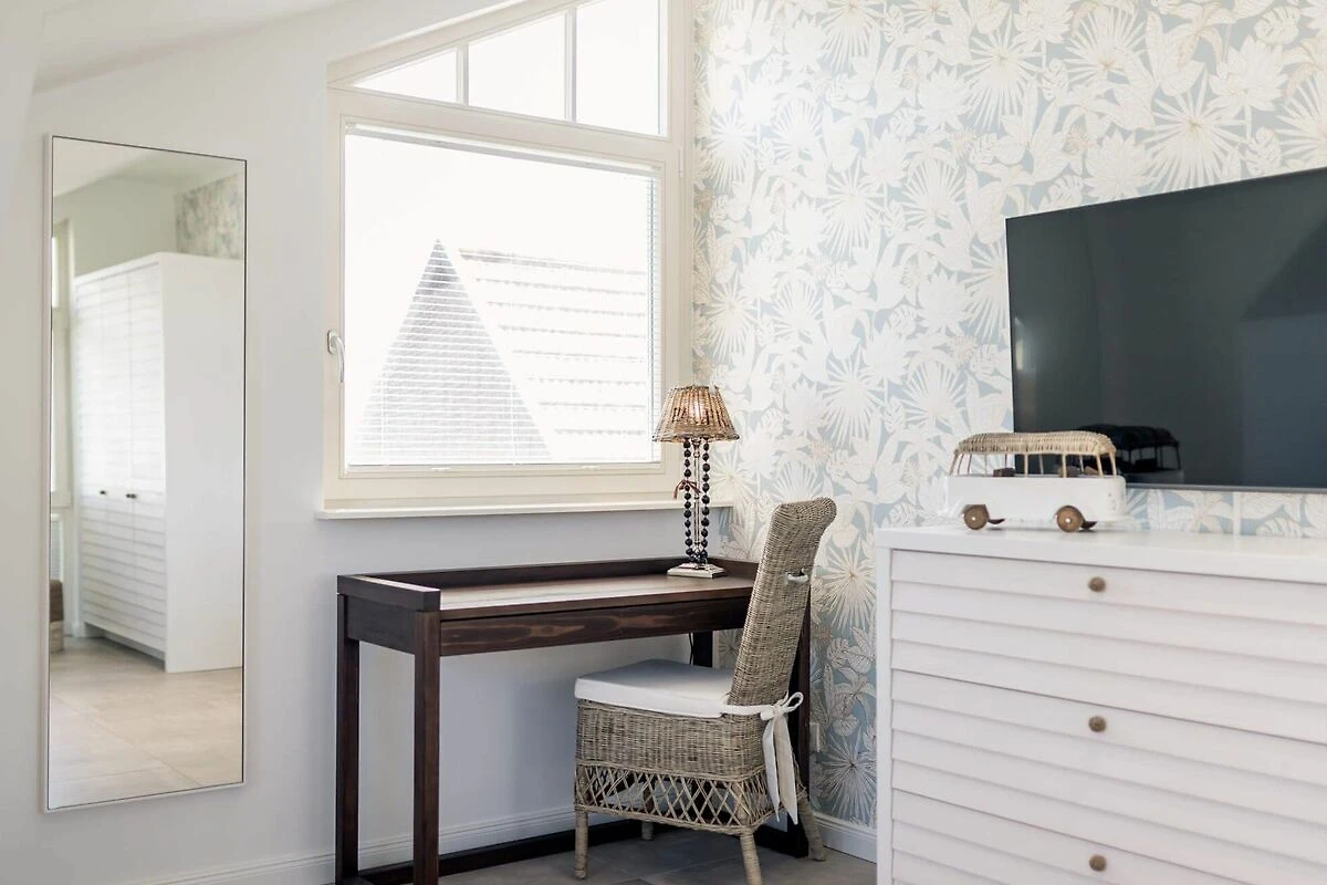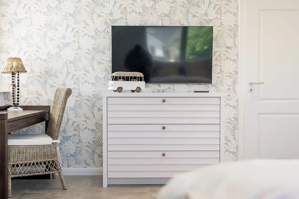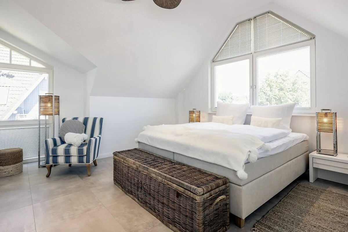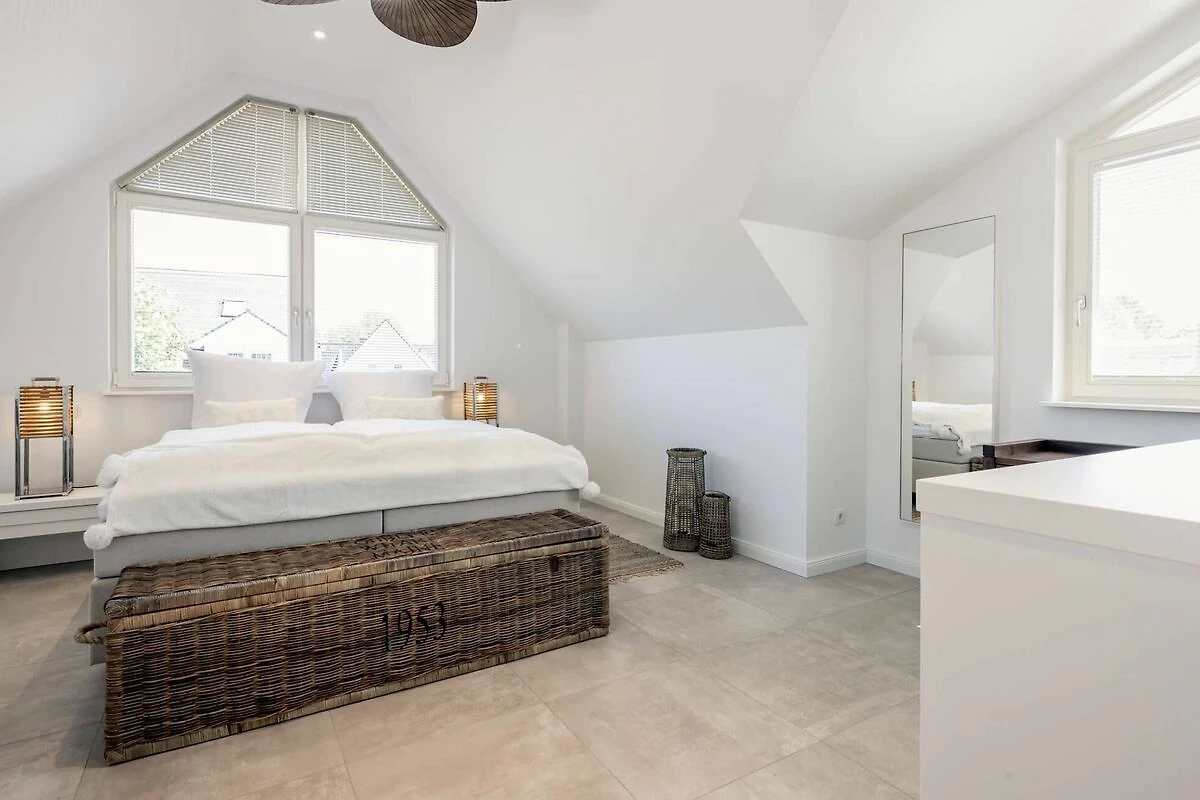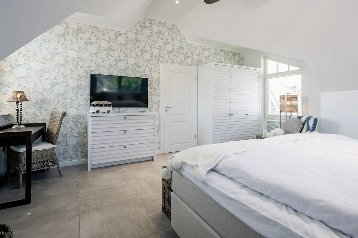 Das Erdgeschoss erfreut mit offener, hochwertig ausgestatteter Küche und lichtdurchflutetem Essbereich. Der Wohnbereich ist gemütlich mit stilvollem Interieur ausgestattet. Ein Schlafzimmer mit zwei Einzelbetten und einem Bad mit ebenerdiger , offener Dusche bietet Ihnen zusätzlichen Komfort. Alle Schlafzimmer sind mit Boxspringbetten ausgestattet und verfügen über Schreibecke und Smart-TV´s.