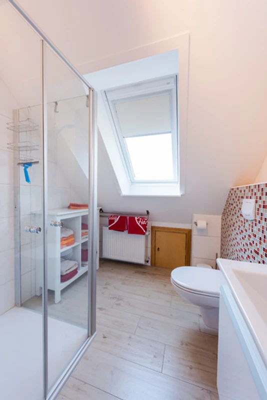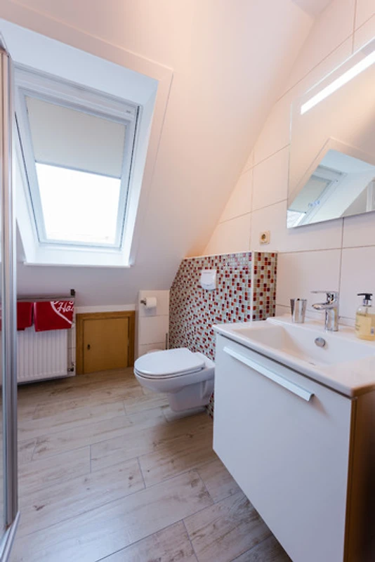 Das Duschbad mit WC ist modern und zweckmässig. Vor der Wohnung gibt es einen grossen Balkon, der sich getrost Dachterrasse nennen darf, mit einladendem Sitzplatz zum Frühstücken und mehr - ein echter Sonnenplatz.