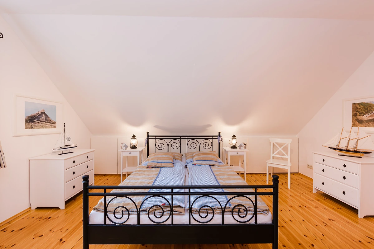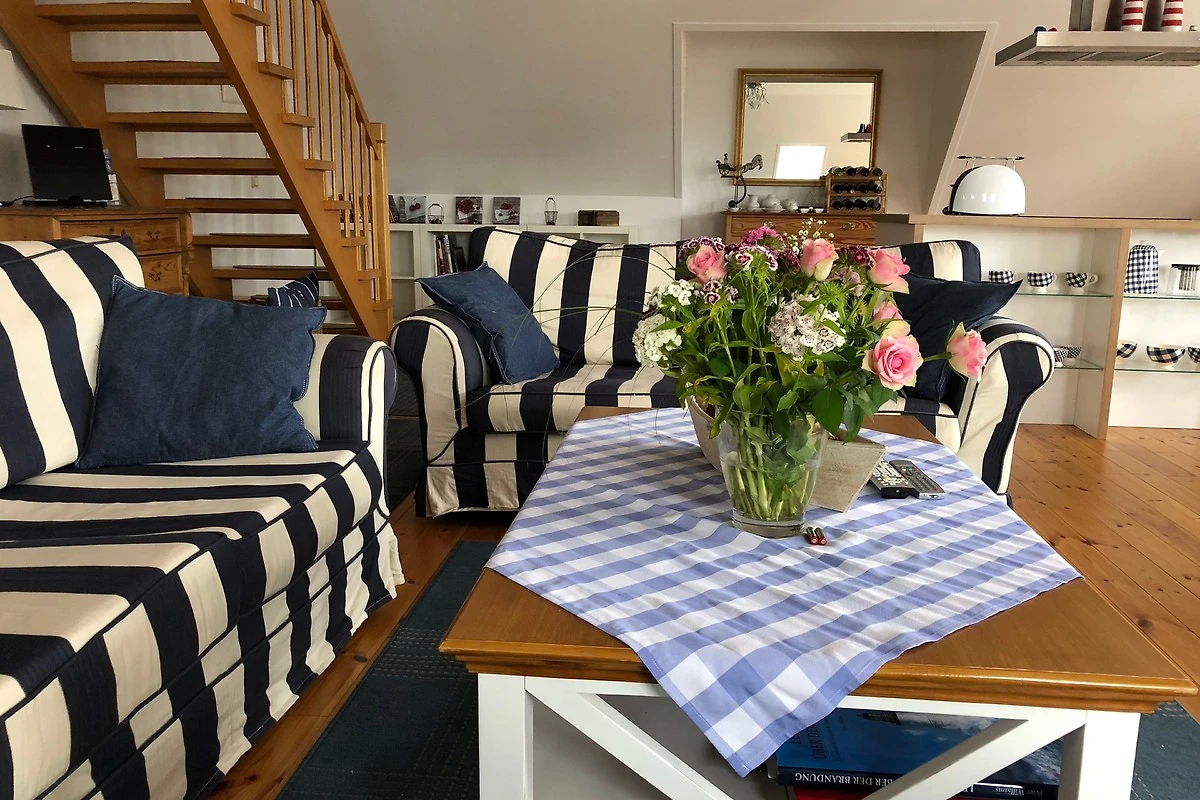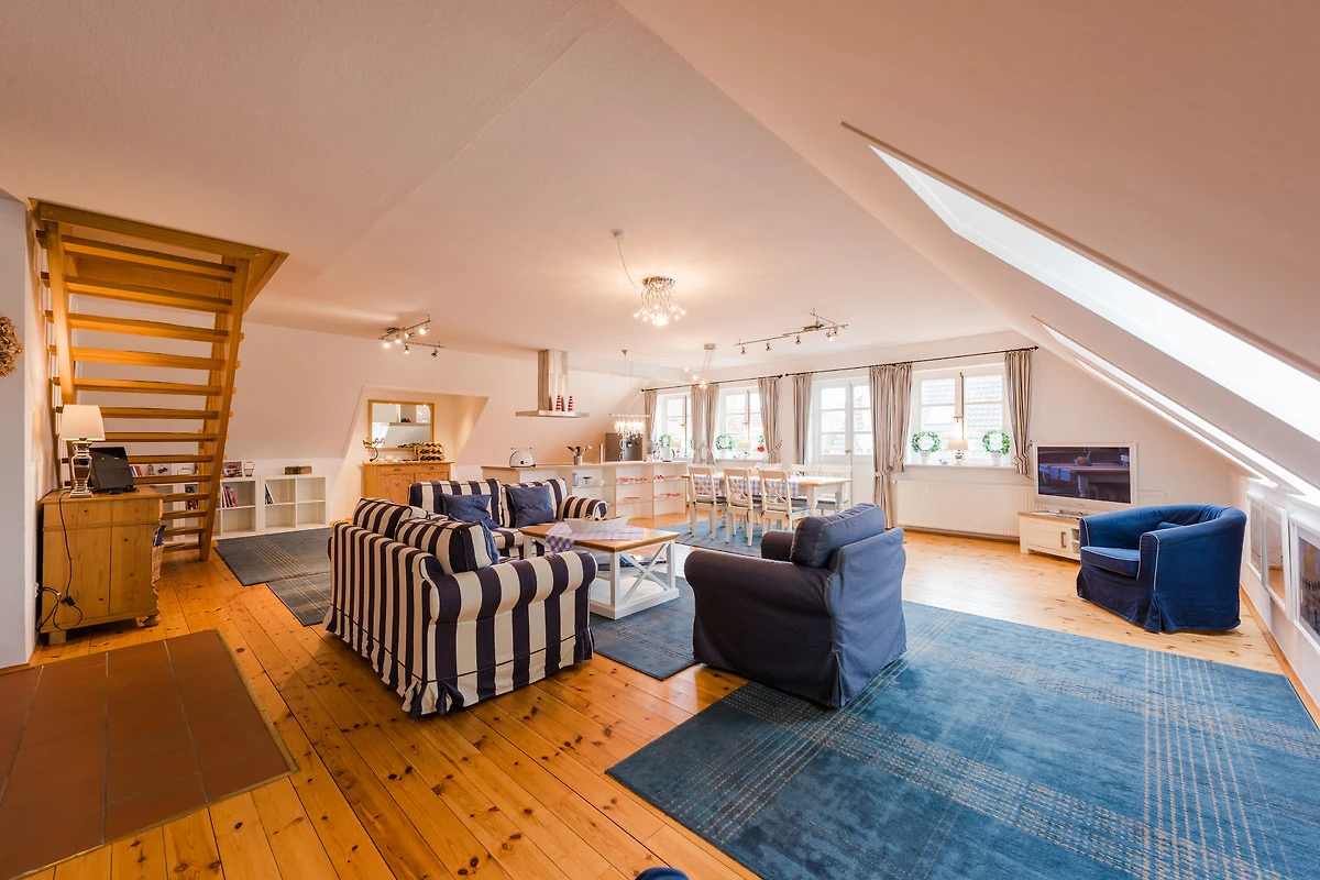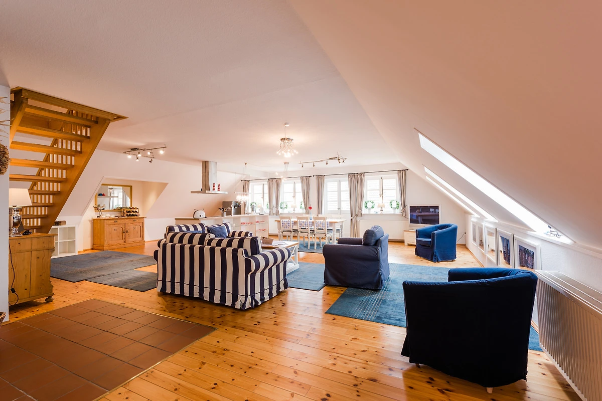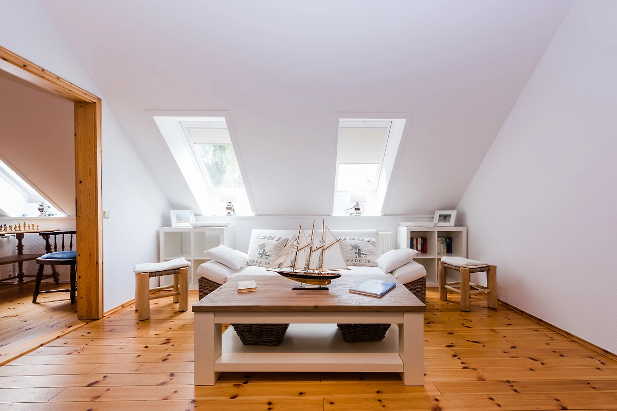 Wer die weitere Ebene nutzen möchte, schaut bitte in der Anzeige unter "Kapitänsbrücke II" nach - bis zu 5 Personen können hier Platz finden - mit zusätzlichem Wohnraum mit Schlafcouch, zweitem Schlafzimmer und einem weiteren Duschbad.