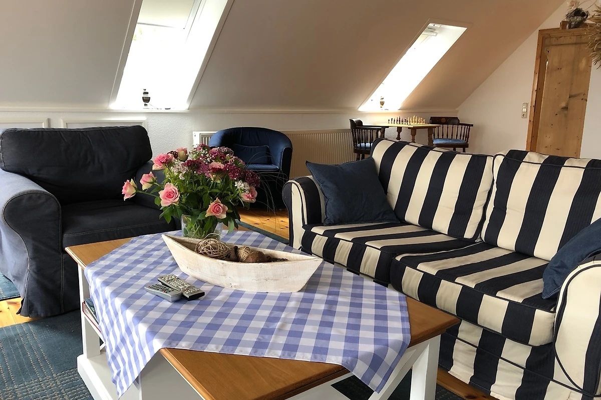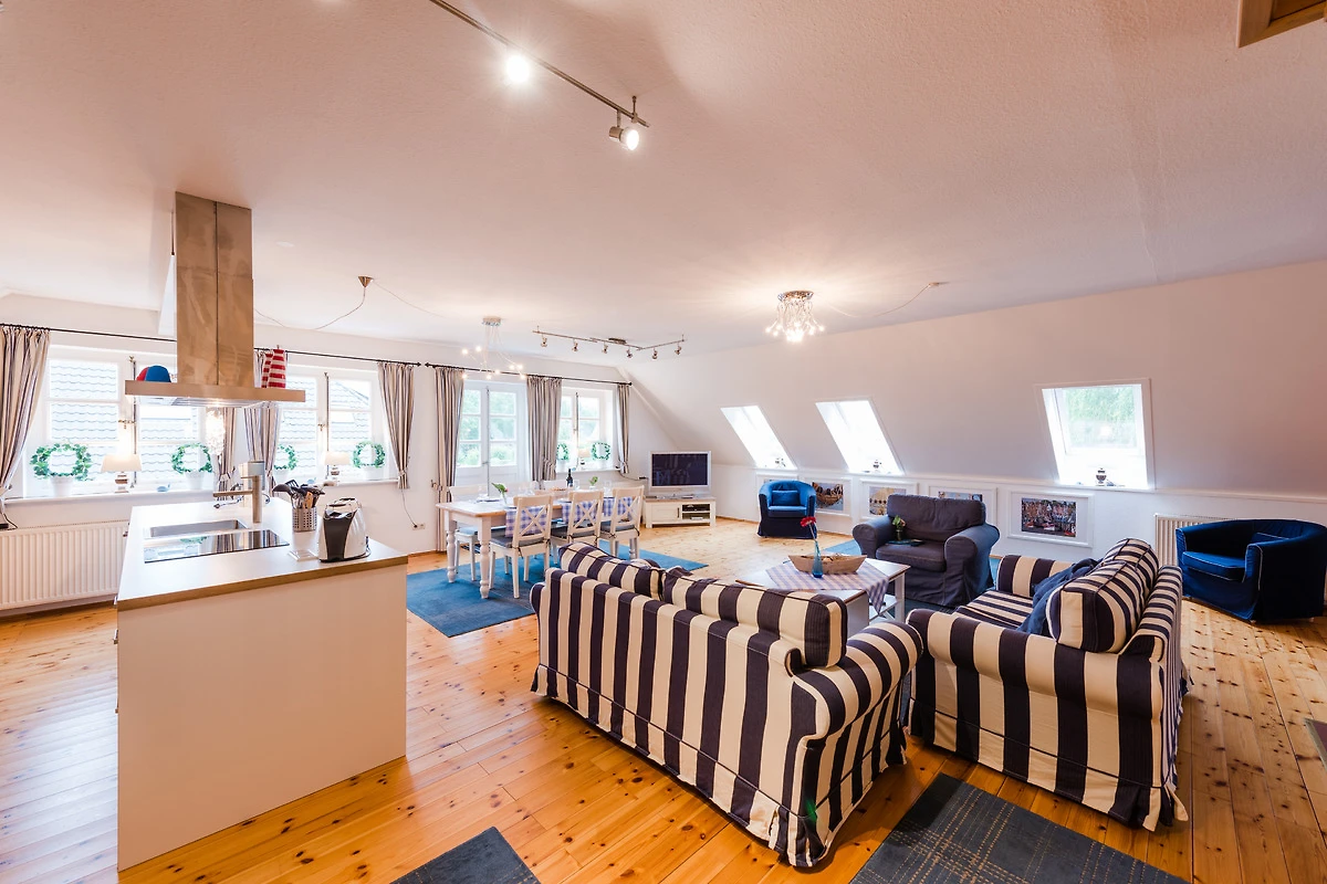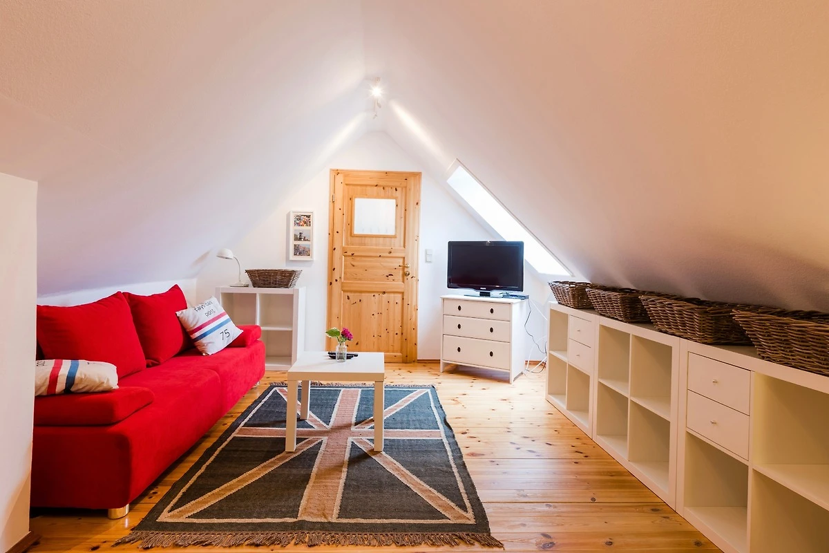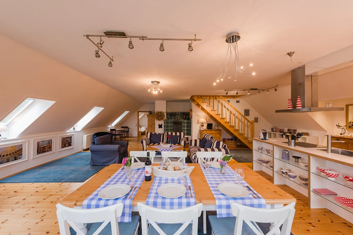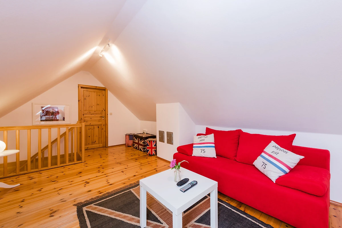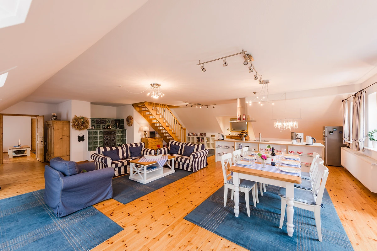 Die untere Etage (ca. 120 qm). umfasst grosszügige Diele, Bad, Schlafzimmer und grossen Wohnbereich. Die zweite Ebene der Wohnung im Dachgeschoss bietet einen zusätzlichem Wohnraum (mit Schlafcouch), ein zweites Schlafzimmer und ein weiteres Duschbad.